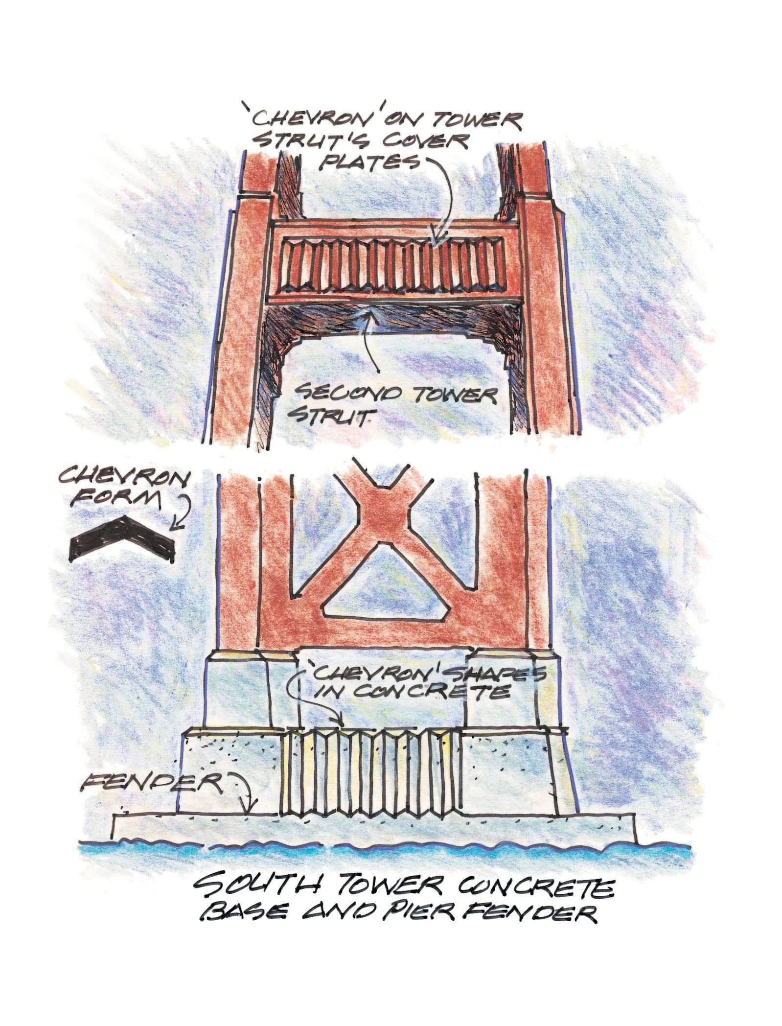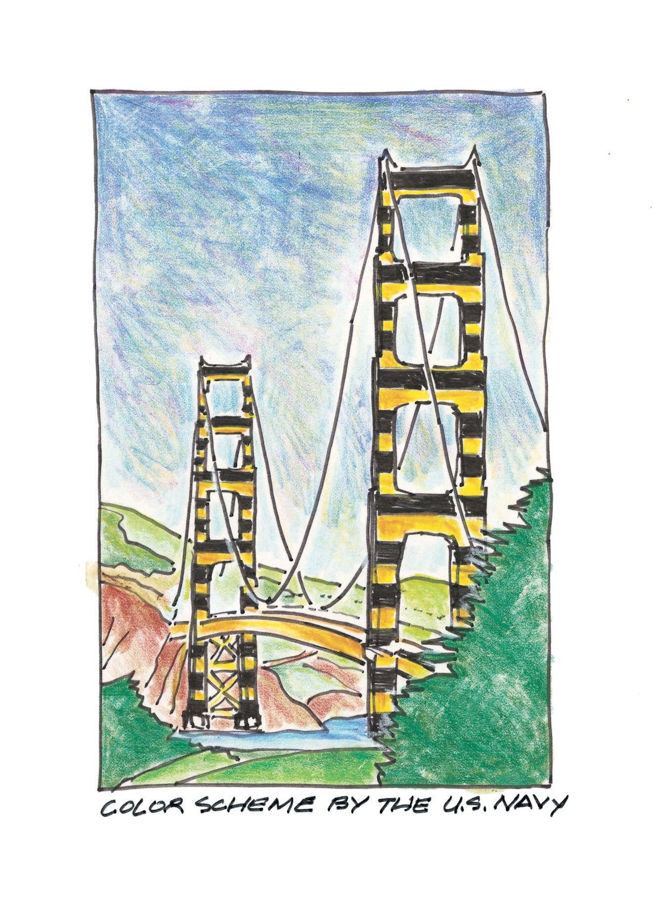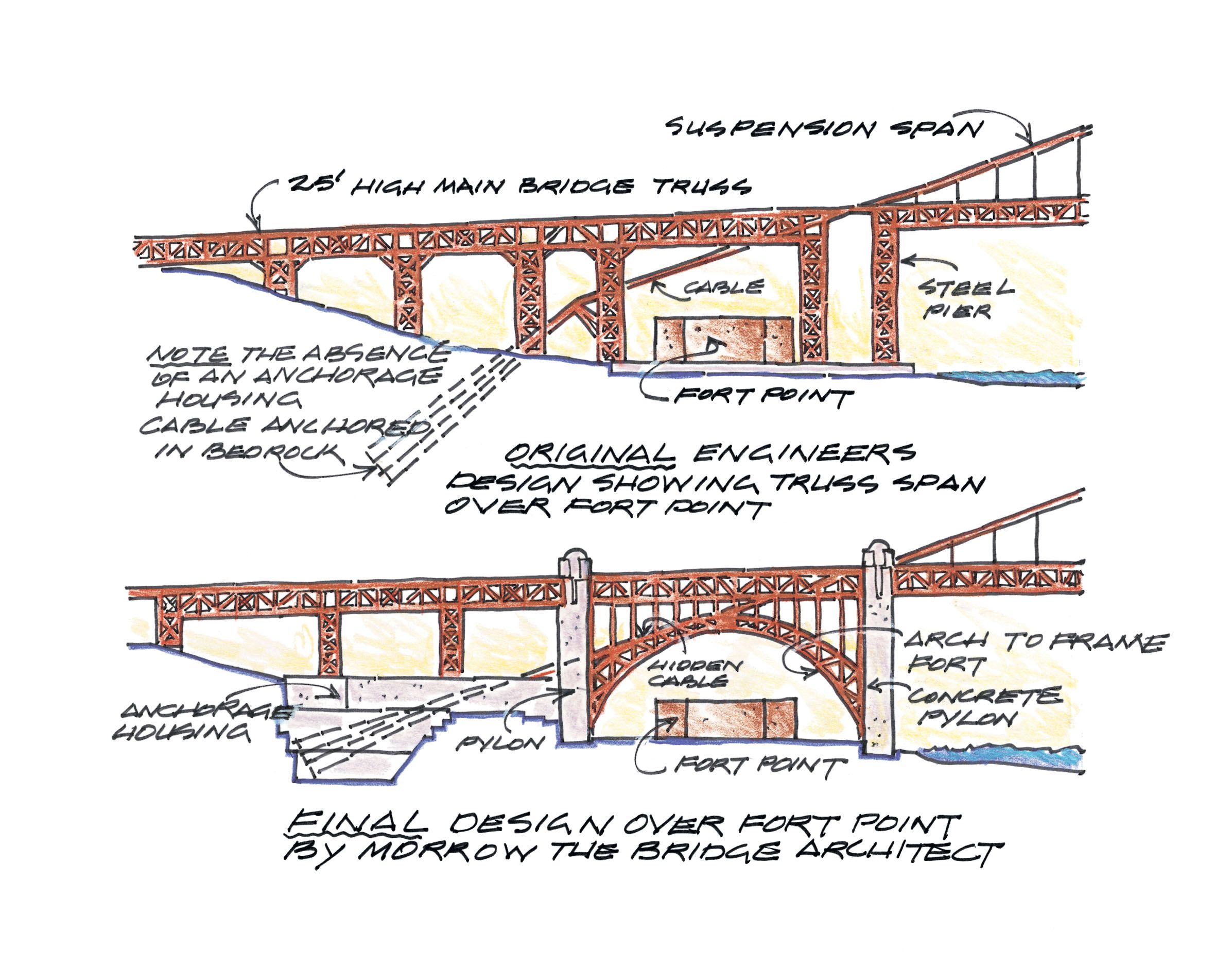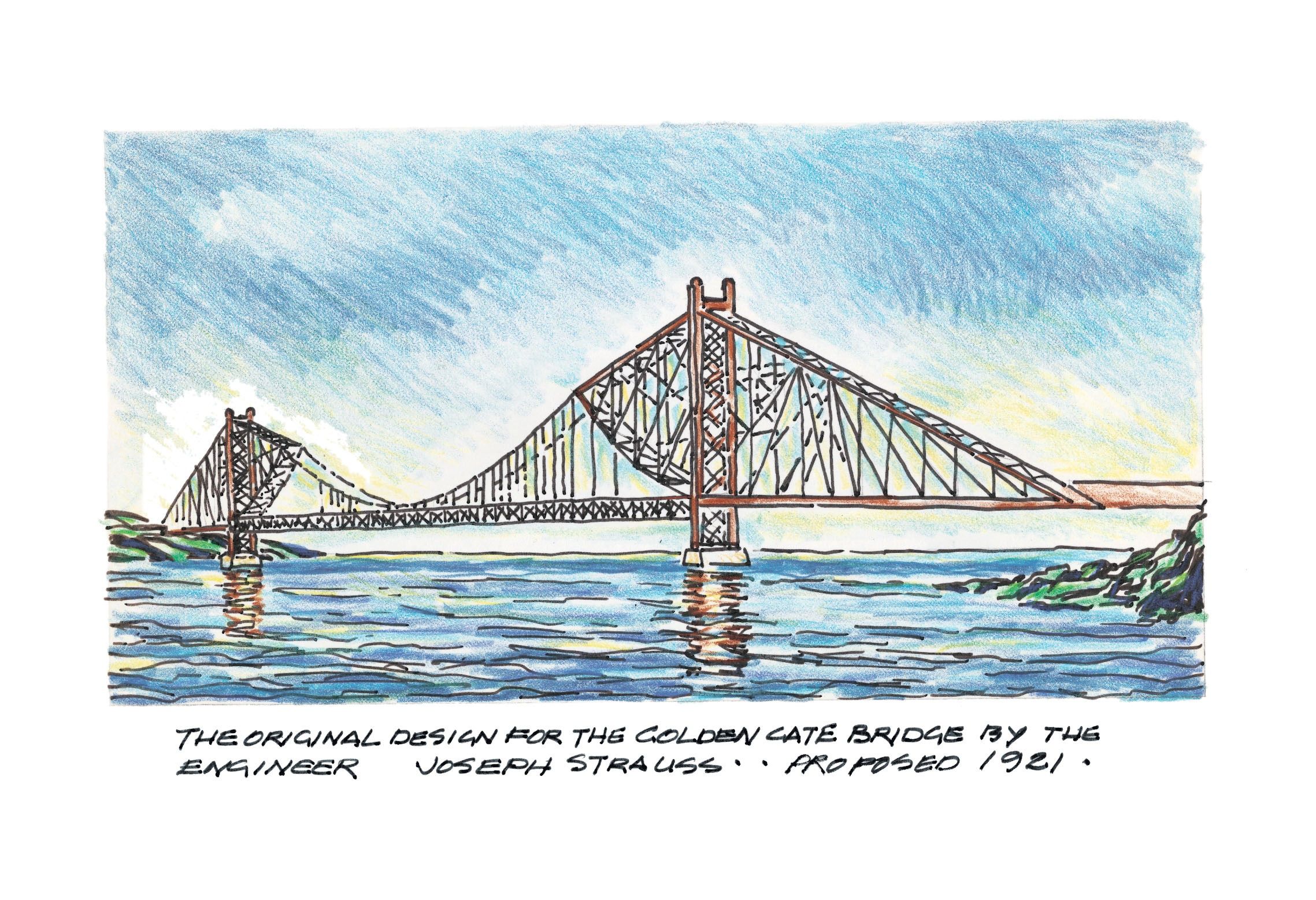 We dug through the archives of our sister company Chronicle Books and pulled a few illustrations from the 2008 book Golden Gate Bridge: History and Design of an Icon by Donald MacDonald. MacDonald is the first architect to work on the Bridge since its completion by its original consulting architects. He redesigned the toll booths to their current form in 1980, installed the new bike rail, and set the guidelines for the bridge’s retrofit. He was also instrumental in the discussion of a possible suicide barrier for the bridge.