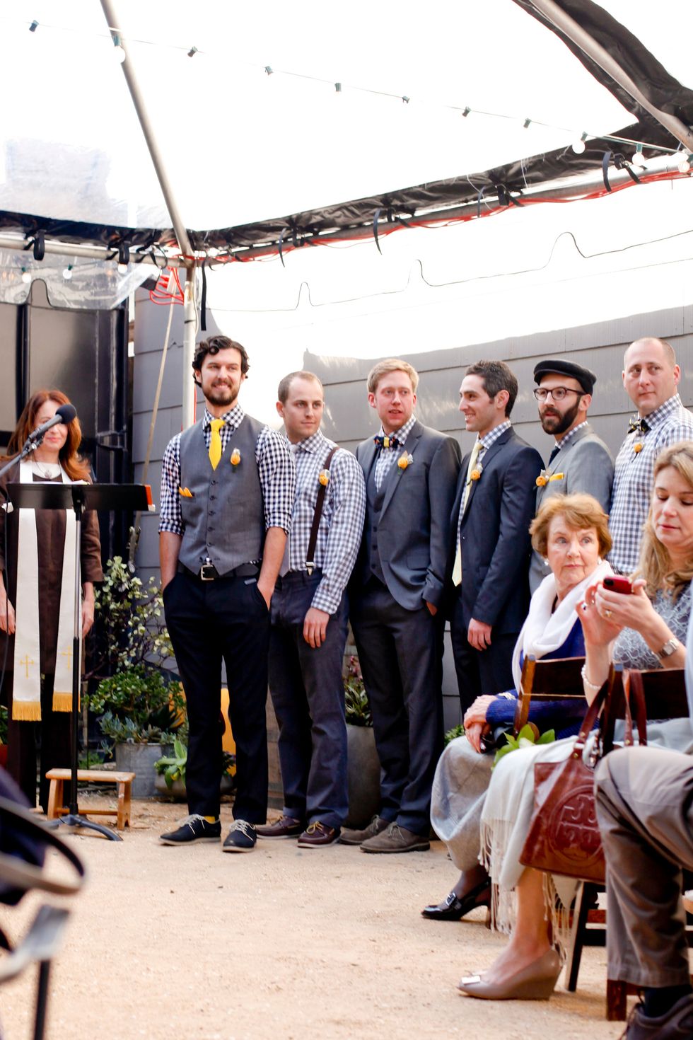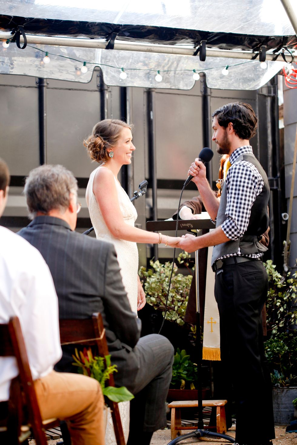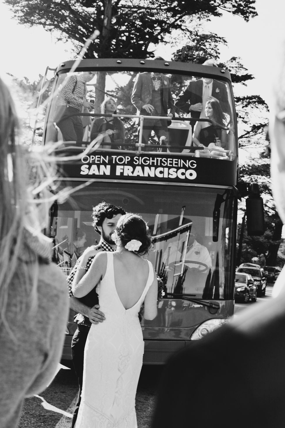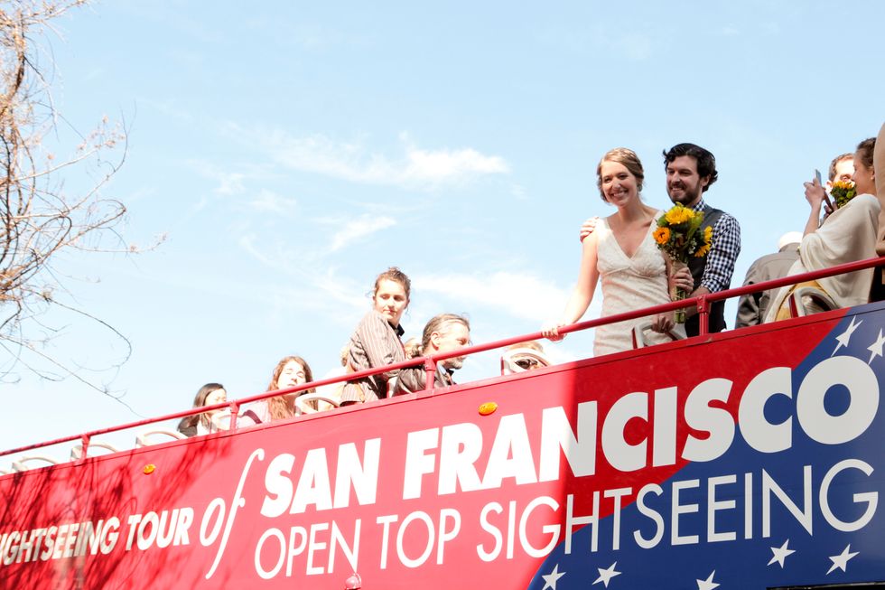 The wedding was held at the Stable Cafe in the Mission, and followed with a cocktail hour on an open top bus that toured them and their East Coast guests through the city. With champagne in a can and local beer, they toured locations like the Palace of Fine Arts, the Cliff House, Dolores Park, and more. Returning to Stable Cafe for the reception, their food was all local and organic, with local wines and rented china plates and mason jars for dinnerware. Instead of flowers, they rented terraniums and succlents to decorate the tables and venue. Guests were even given an assortment of Craftsman & Wolves pastries, a favorite of the newlyweds. With pies from Mission Pie for dessert, they finished off their special day by heading around the corner to Mission Bowling Club for their bowling afterparty.