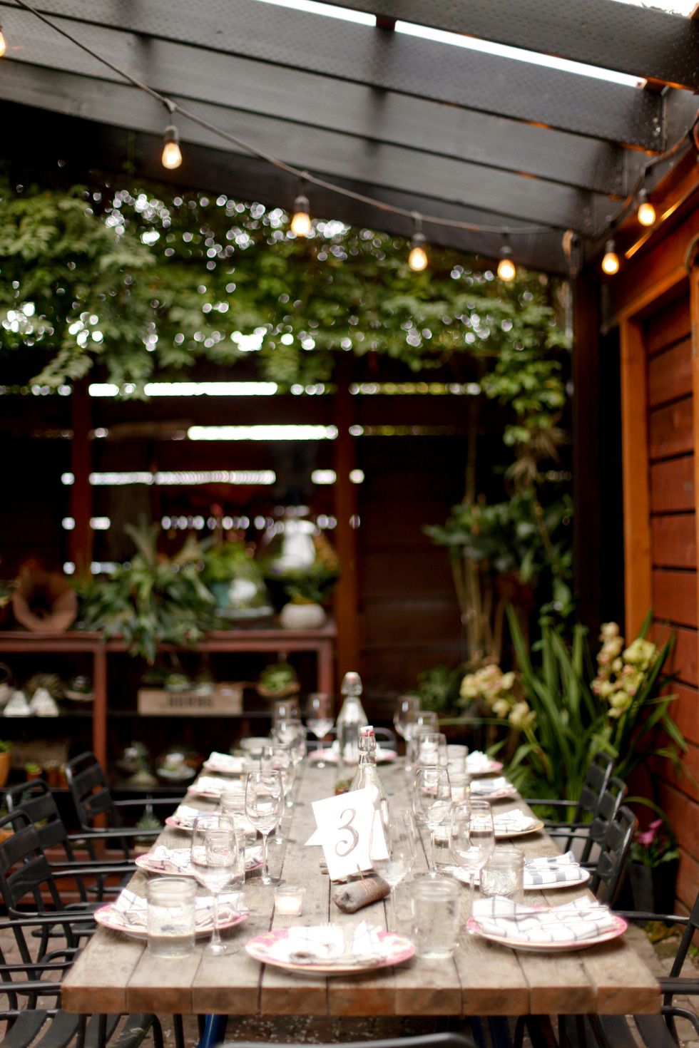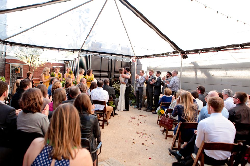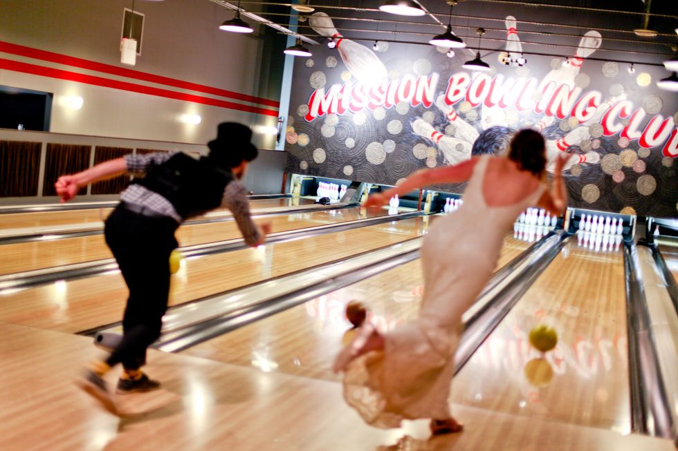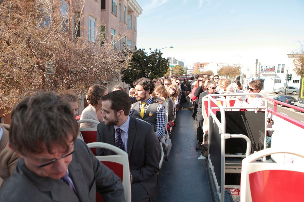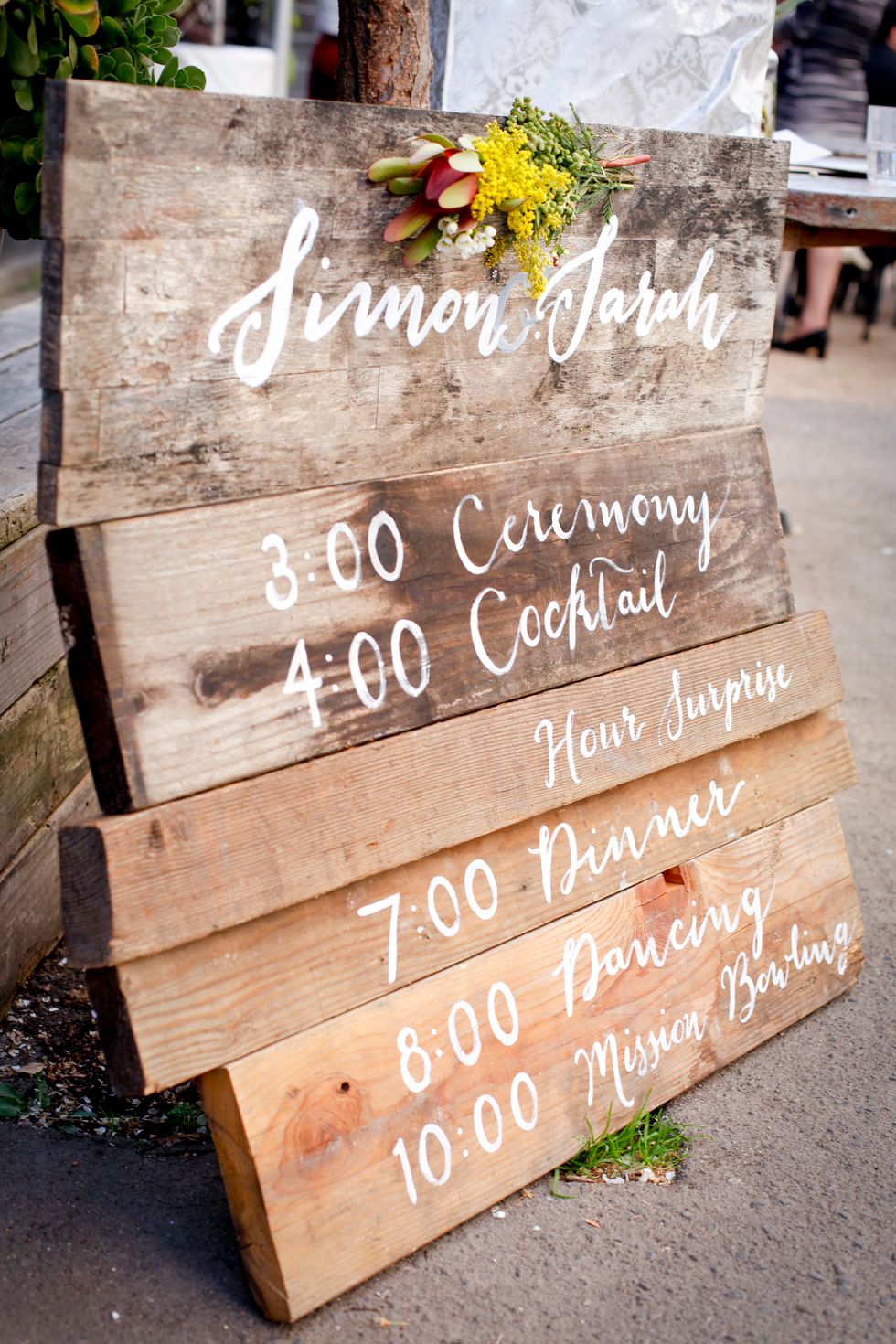 The wedding was held at the Stable Cafe in the Mission, and followed with a cocktail hour on an open top bus that toured them and their East Coast guests through the city. With champagne in a can and local beer, they toured locations like the Palace of Fine Arts, the Cliff House, Dolores Park, and more. Returning to Stable Cafe for the reception, their food was all local and organic, with local wines and rented china plates and mason jars for dinnerware. Instead of flowers, they rented terraniums and succlents to decorate the tables and venue. Guests were even given an assortment of Craftsman & Wolves pastries, a favorite of the newlyweds. With pies from Mission Pie for dessert, they finished off their special day by heading around the corner to Mission Bowling Club for their bowling afterparty.