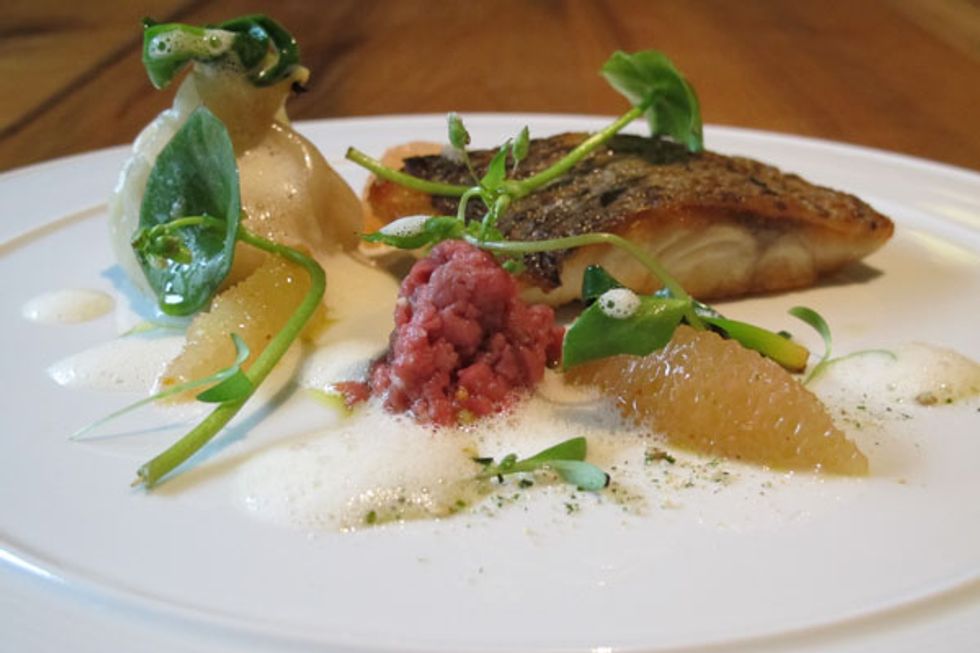 Parallel 37 Chef Michael Rotondo turns to the sea for jerky inspiration–and yes, there is still some beef involved. He does geoduck Panopea generosa clam jerky that is folded into a dumpling. Rotondo’s jerky-centric dish also includes Wagyu beef, sea bream, pomelo, Miner’s lettuce and a pomelo emulsion—fork required.