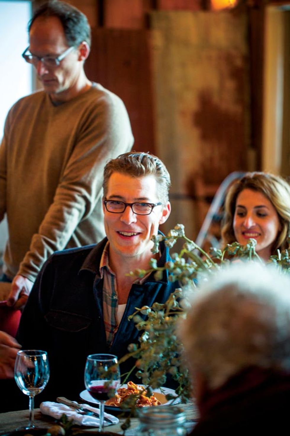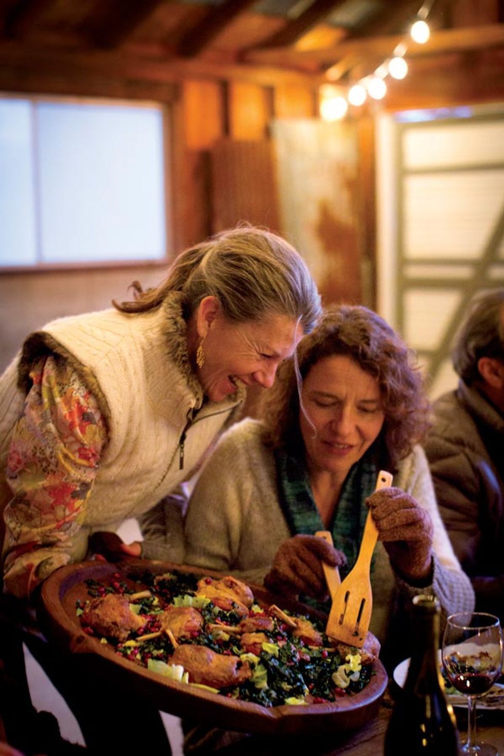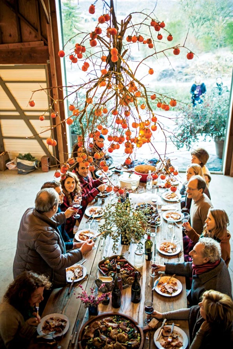 It was this man and his new pantry staple that inspired our own hunt, and the latter was sprinkled at the forthcoming communal supper, which my husband Hal and I hosted at our home in Healdsburg. As food lovers, we knew that it was a once-in-a-lifetime opportunity for us to learn on a visceral level about our local food chain. A locavore philosophy guided the occasion: Everything from the alpaca throws to the persimmons that went into making the chandelier were sourced from the Healdsburg area. A celebration of the region’s bounty called for notable dinner companions. So, we enlisted a James Beard–nominated chef, a local farmhand, an organic rancher, and others to join us for a potluck. They came and filled our plates with homegrown morsels and our glasses with local wines. We even found ourselves a boar hunter.