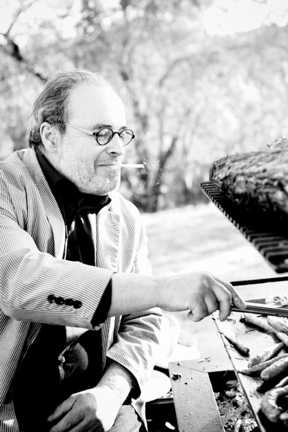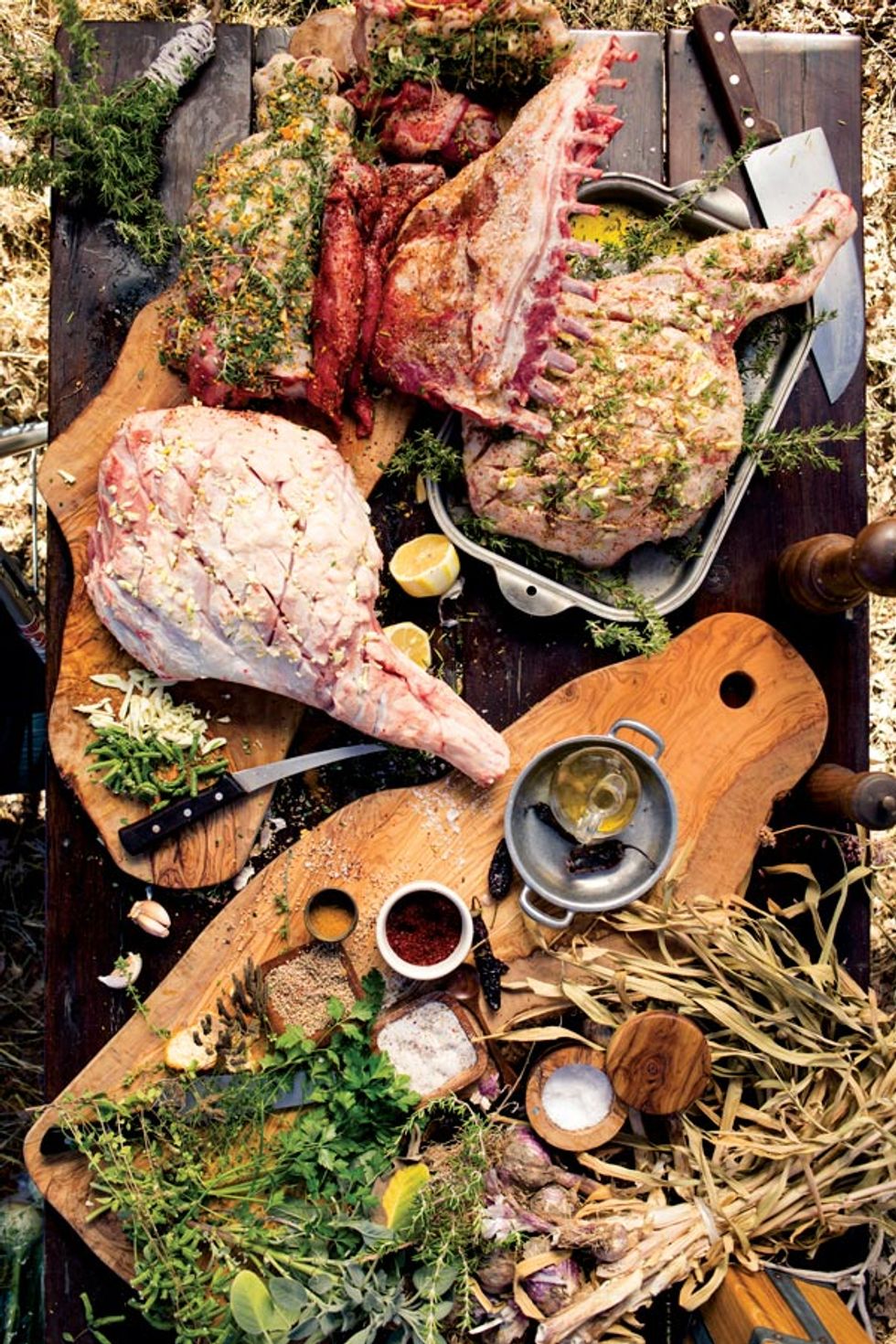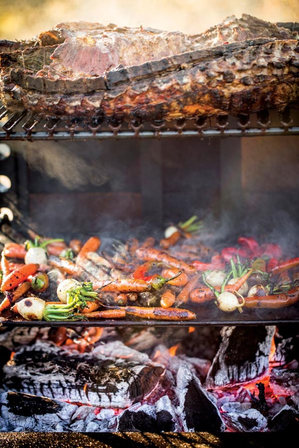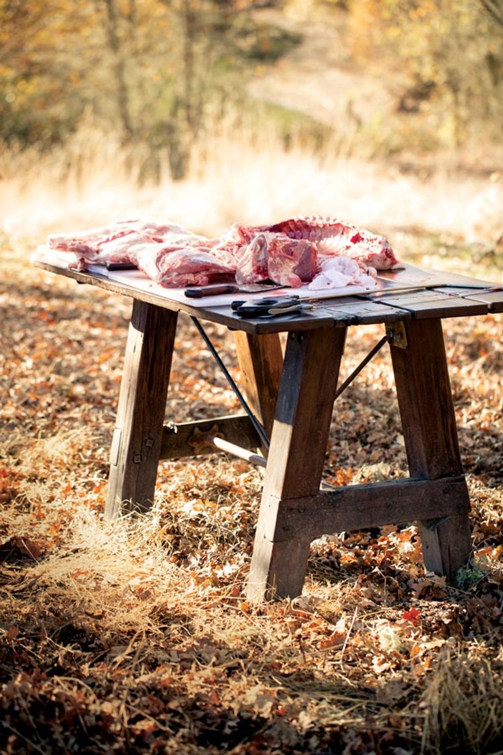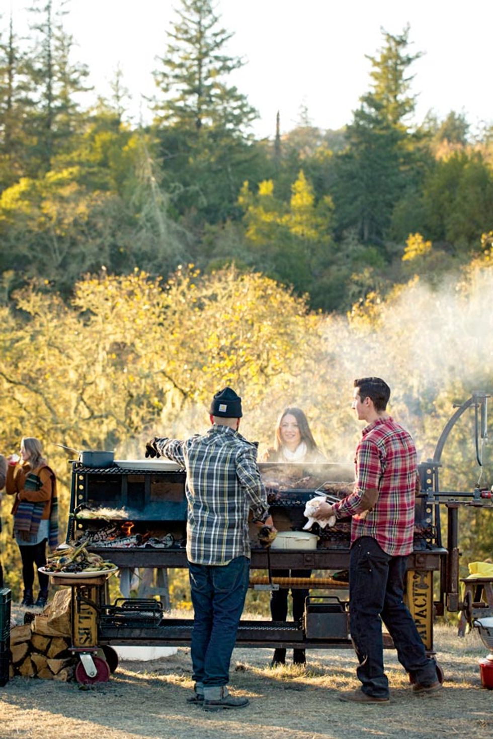 Clad in Diesel jeans and black D&G frames, the burly-bearded Dino Bugica starred as our hunter-gatherer. A 38-year-old Geyserville resident of Italian descent, Bugica learned the art of living and eating well from the women in his family. Born in Reno, Nevada, he moved to Italy when he was 18 to study butchery and winemaking under Tuscan masters and sharpened his chef skills in restaurants in Pisa and Versilia before moving to Northern California. After five years at Santi, a beloved eatery (now shuttered) in Geyserville, Bugica opened Diavola there in 2008. With exposed brick, warm wood floors, and hefty legs of meat hanging from hooks by the bar, Diavola would be at home in any rustic Italian hamlet. On the brick oven is emblazoned the head of a boar in a nod to Bugica’s specialty: transforming whole beasts into beautiful salumi and house-cured sausages. Bugica brought his beautiful cuts of meat and his mammoth, custom-made Argentinian-style grill to our hilltop meadow overlooking the vineyards of Dry Creek Valley.