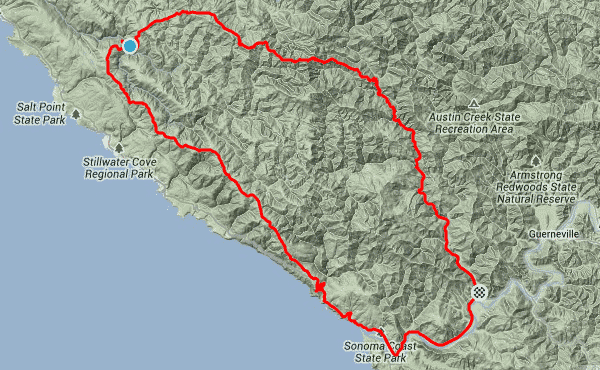 At 43 miles we meet the Russian River at Jenner, where you can refresh for the easy seven miles ride back to your vehicle. Keep in mind that this ride is in very remote area, with infrequent vehicle traffic, spotty or unavailable cell phone reception, and no stores, restrooms, potable water available for 40 miles, therefore you should be not ride alone and be prepared for all eventualities - a spare tire, tools, plenty of food and an extra water bottle or hydration pack are essential.