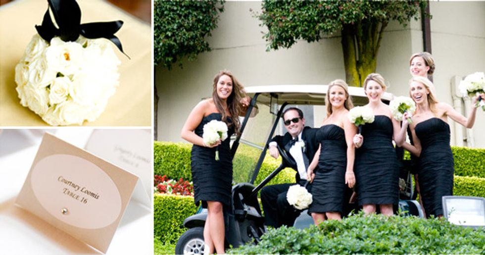 The dress, rush ordered at the last minute when she changed her mind about her first pick, was a fitted white gown with a trumpet skirt. White, of course, is the traditional choice of brides—but it just so happens black and white has been Jenn’s favorite color combination since childhood, so it fit the vision perfectly. “I love the palette because it’s clean and simple and not overdone,” she says. “Plus, my bridesmaids got to wear black dresses they really liked and could use later.”