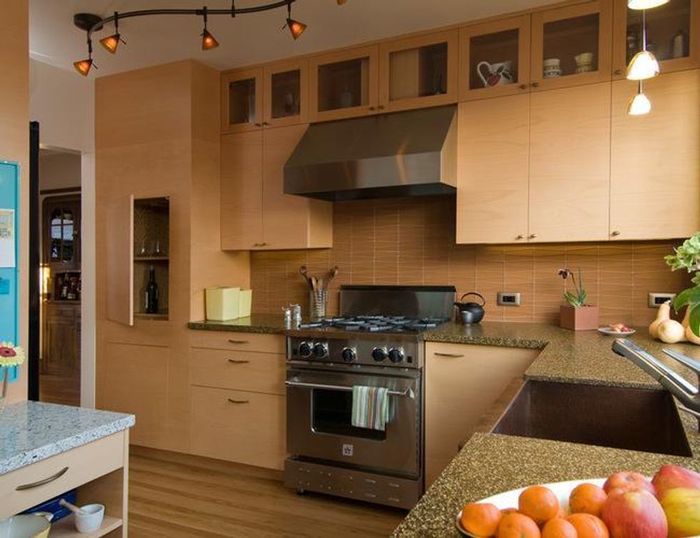 She envisioned a home with lots of beautifully finished woodwork, so she tapped furniture and cabinet maker Marc Waidelich to build lots of custom cabinetry, including the cherry units seen here. "It was really worth it," Lomax says. "Every possible ounce of space is usable. We now have bookshelves, nooks and crannies. There's no space in the house that isn't functional and usable."