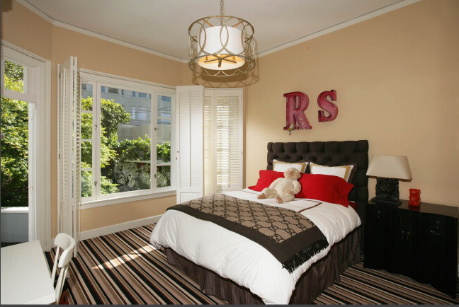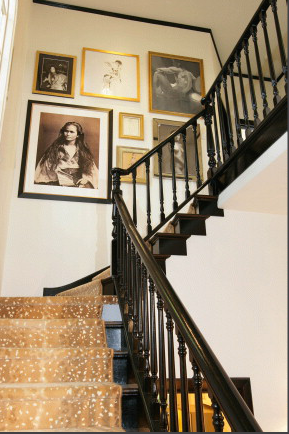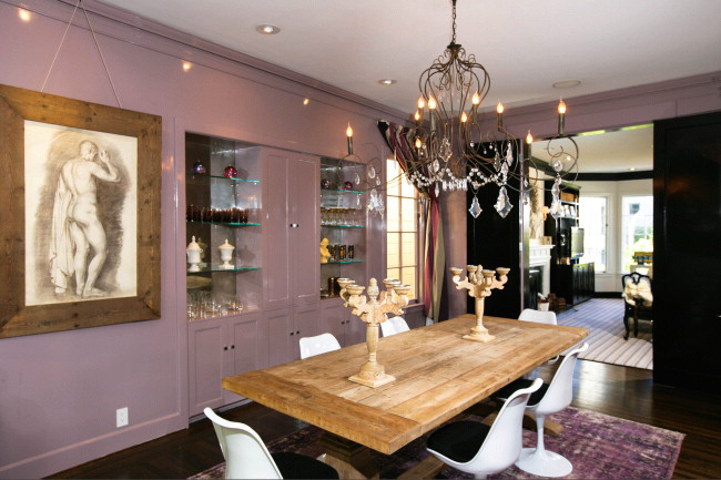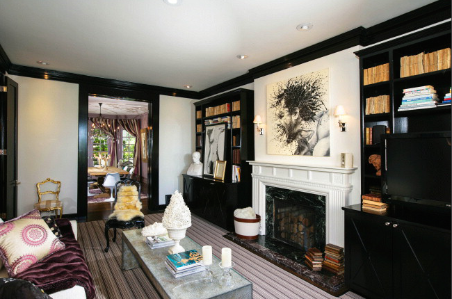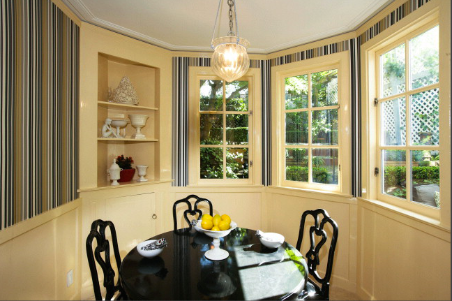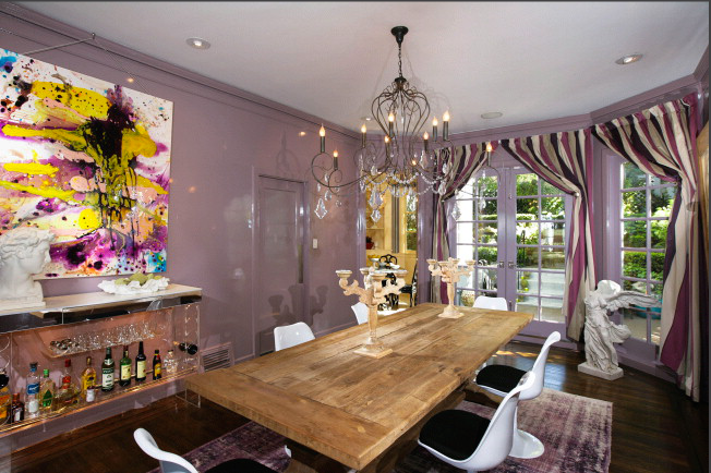 This colorful Pac Heights home is not for the faint of heart. From the black-lacquered staircase to the bright purple walls and striped curtains, it's just a teeny bit over the top.