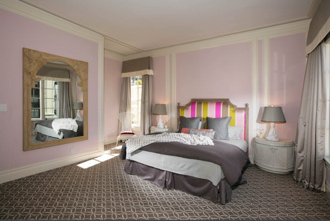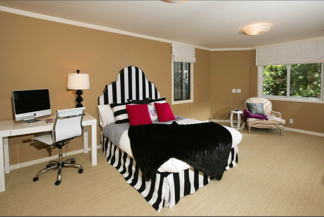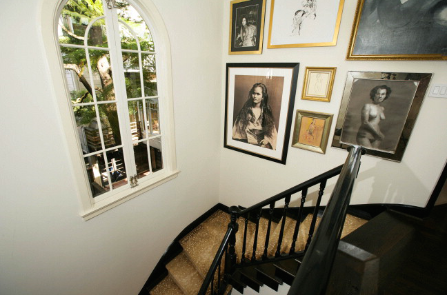 At least the designer was consistent – there are more stripes and bold colors to be found in the carpeted living room, kitchen, and in the bedrooms (plus a zebra-striped bed). Ironically, the only neutral aspect of the house is the array of nudes – the art form, not the color palate – that seem to cover most of the walls.