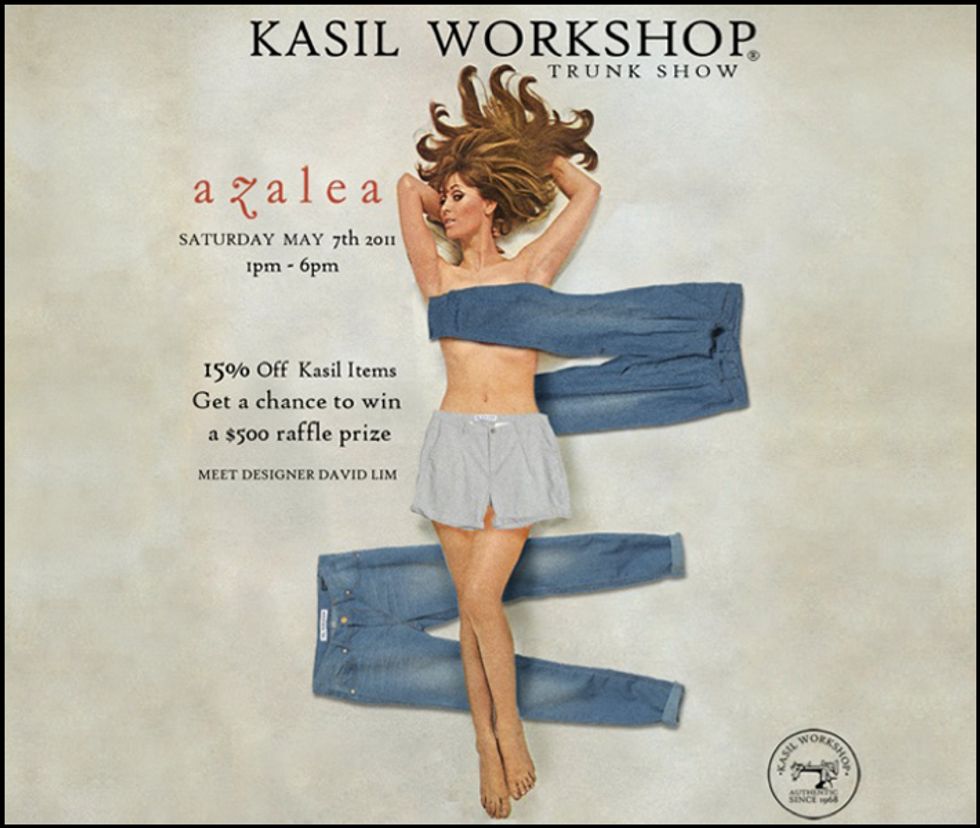Kasil Workshop denim designer, David Lim, is stopping by SF for two trunk shows this weekend. First, head to Blues Jean Bar today for the Kasil pop-up shop and receive 20% off all Kasil denim. If you can't make it, round two goes down tomorrow, so mosey on over to Azalea for the Kasil Workshop trunk show, with 20% off the Kasil Spring/Summer '11 collection and a $500 raffle prize.