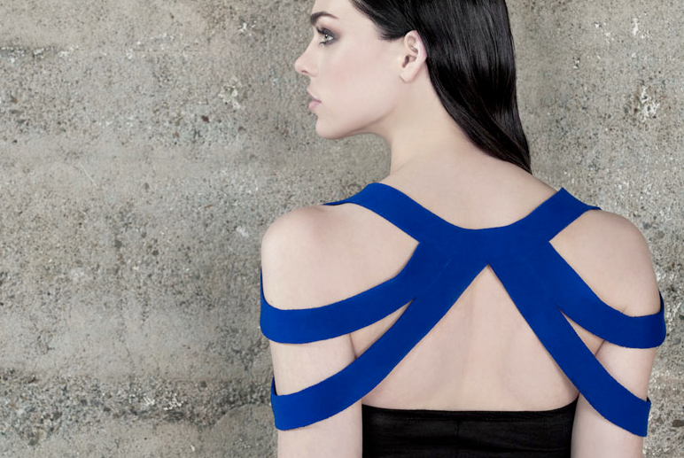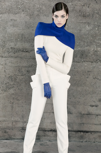 Camelia Skikos' latest collection, "Out of the Blue" showcases her signature cut-out overlays and geometric lines, but this time with sharp doses of blue, cream and black.