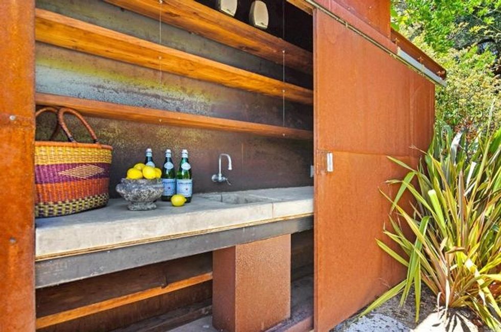 One small, contemporary house is constructed of glass and steel for indoor/outdoor vibes—think floor-to-ceiling windows and sliding glass doors. With custom fir cabinets and shelves and concrete floors, the open floor plan holds one bedroom, a wood-burning fireplace, and a sprawling chef's kitchen. An outdoor lounge area with a twinkling chandelier promises ambient alfresco cocktailing before meals on the dining terrace crowned with a canopy of grapevines. There's even a dedicated area for prep and storage outside.