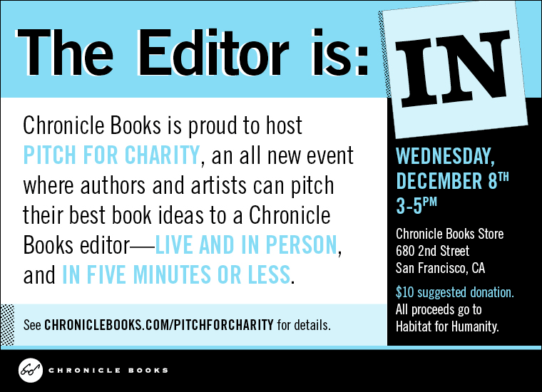 If so, shh! Don't tell. Instead, come up with a five-minute spiel, then make tracks over to their SF bookstore today at 680 Second Street. This afternoon from 3 to pm at Chronicle Books editor will be there to listen to your best pitch. Why? Glad you asked. Along with your brilliant book idea, bring along 10 bucks or, if your feeling generous, more. It's the suggested donation for would-authors to participate, and it's all going to Chronicle's charity of choice, Habitat for Humanity. So you get to share your brilliant idea, get feedback from an editor, and support a good cause. And who knows? Maybe I'll be staring at your book up on my shelf before too long.