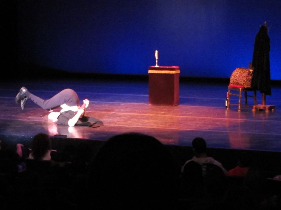 He also proved himself a clumsy but somehow graceful dancer, with the aid of a surreal, inane invention. Two shoes (exact replicas of the sizable black shoes he was already wearing) preceded Kubinek’s actual feet, attached like stilts to his knees, so that one of these three feet on each leg was always touching the ground when he moved. The invention’s real-life utility may be zero sum, but onstage Kubinek harnessed its full handicapping capacity, at first nearly falling into the crowd, but eventually pirouetting stage left to stage right like a White Swan’s grandfather.