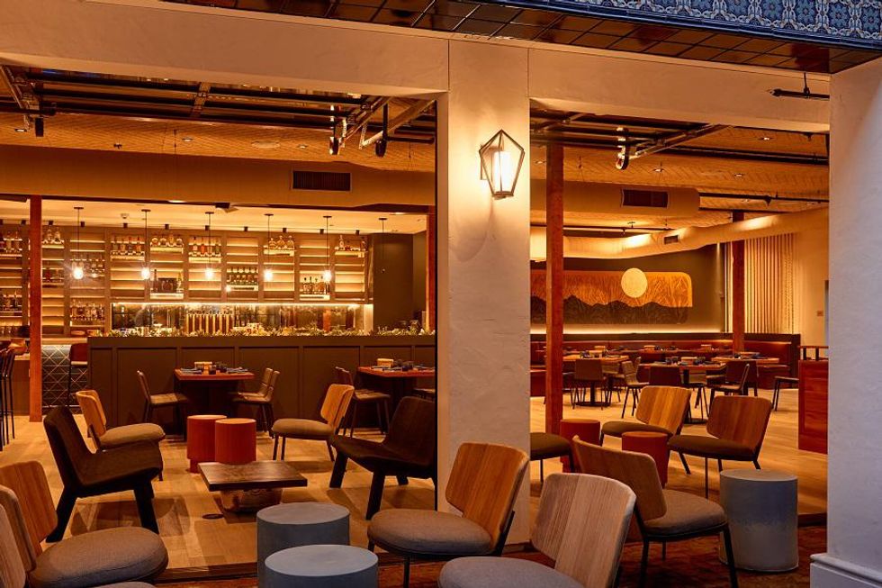 Rustic hanging ropes divide the bar from the dining room, a section dominated by a wide mural evocative of Mexico’s agave landscapes. The room is temporarily closed, says Des Jardins because, as is still the case in much of the restaurant world, El Alto is suffering from a shortage of front-of-the-house staff.
