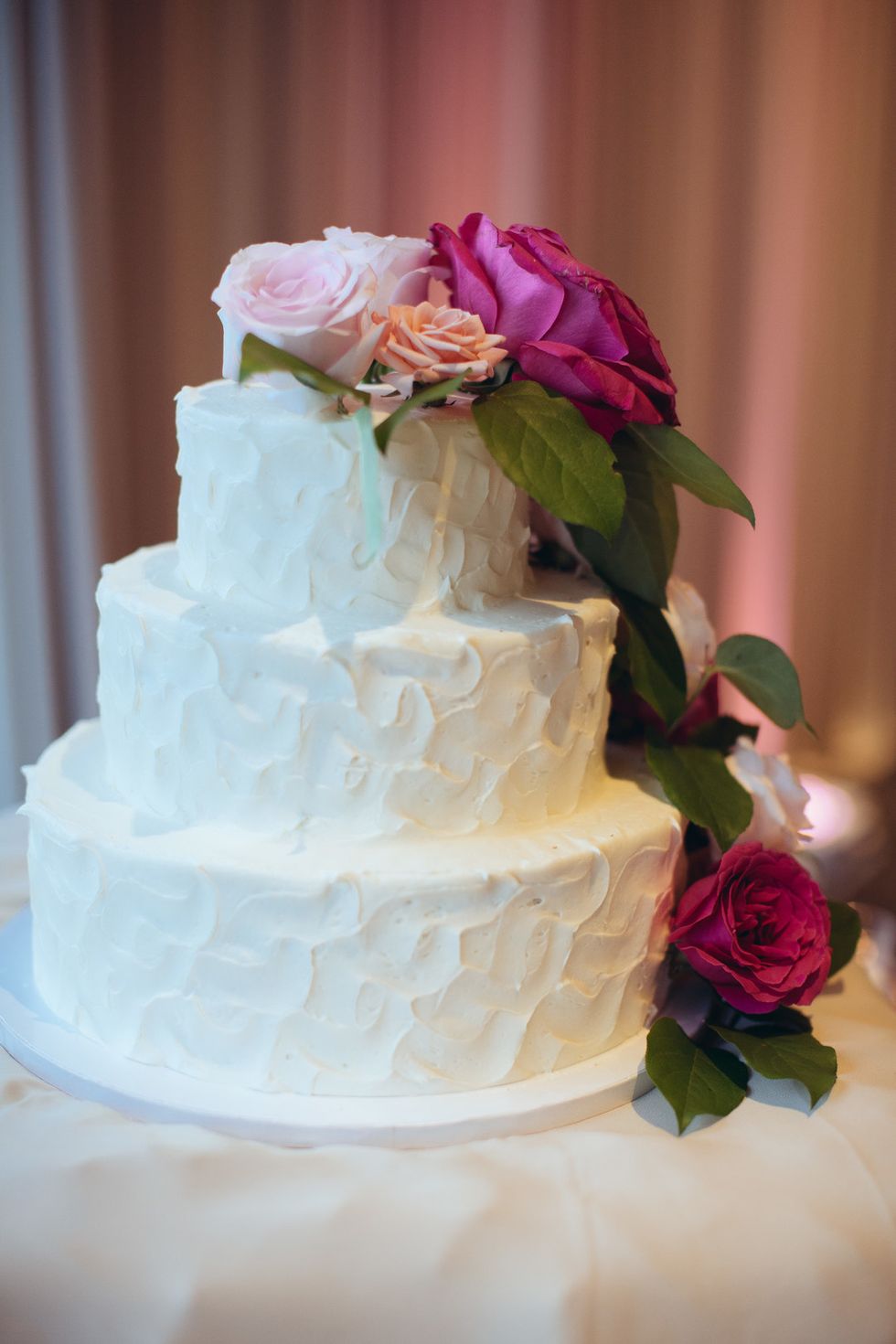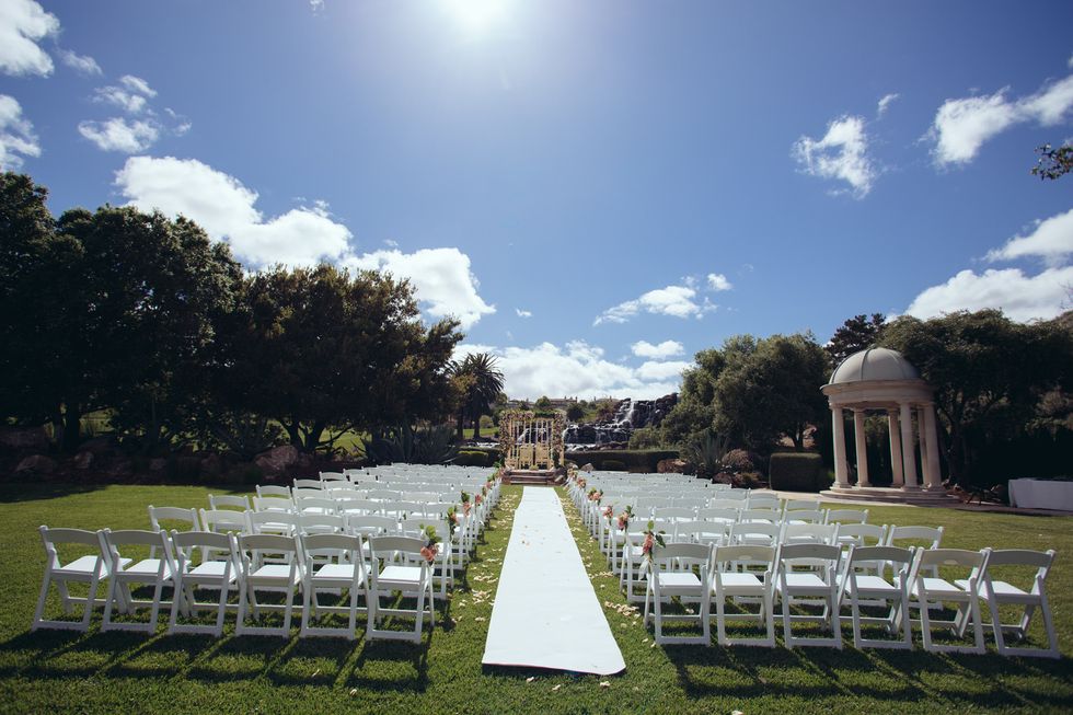 After walking back down the aisle together as husband and wife, they enjoyed the waterfalls on the grounds before making their big appearance at the reception. Each table bursts with creamy florals, and the party indulged in a three-tiered cake. The two appeared as Mr. and Mrs. in a sleek tuxedo and richly embellished two-piece gown, twirling on the dance floor before taking to a plush loveseat under an arch of multihued florals.