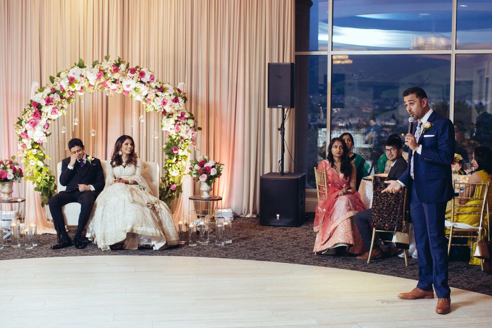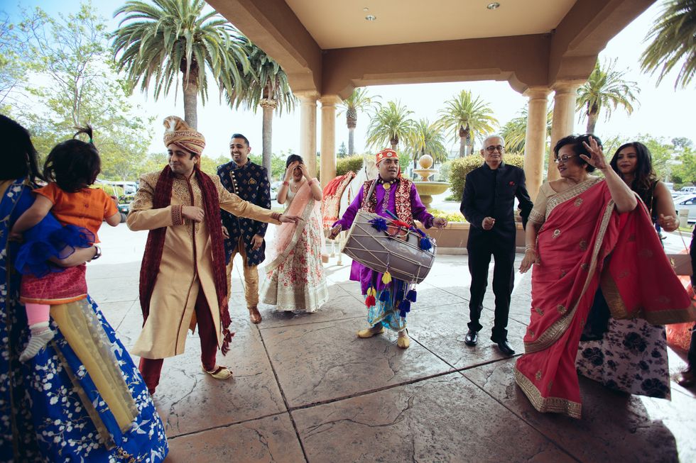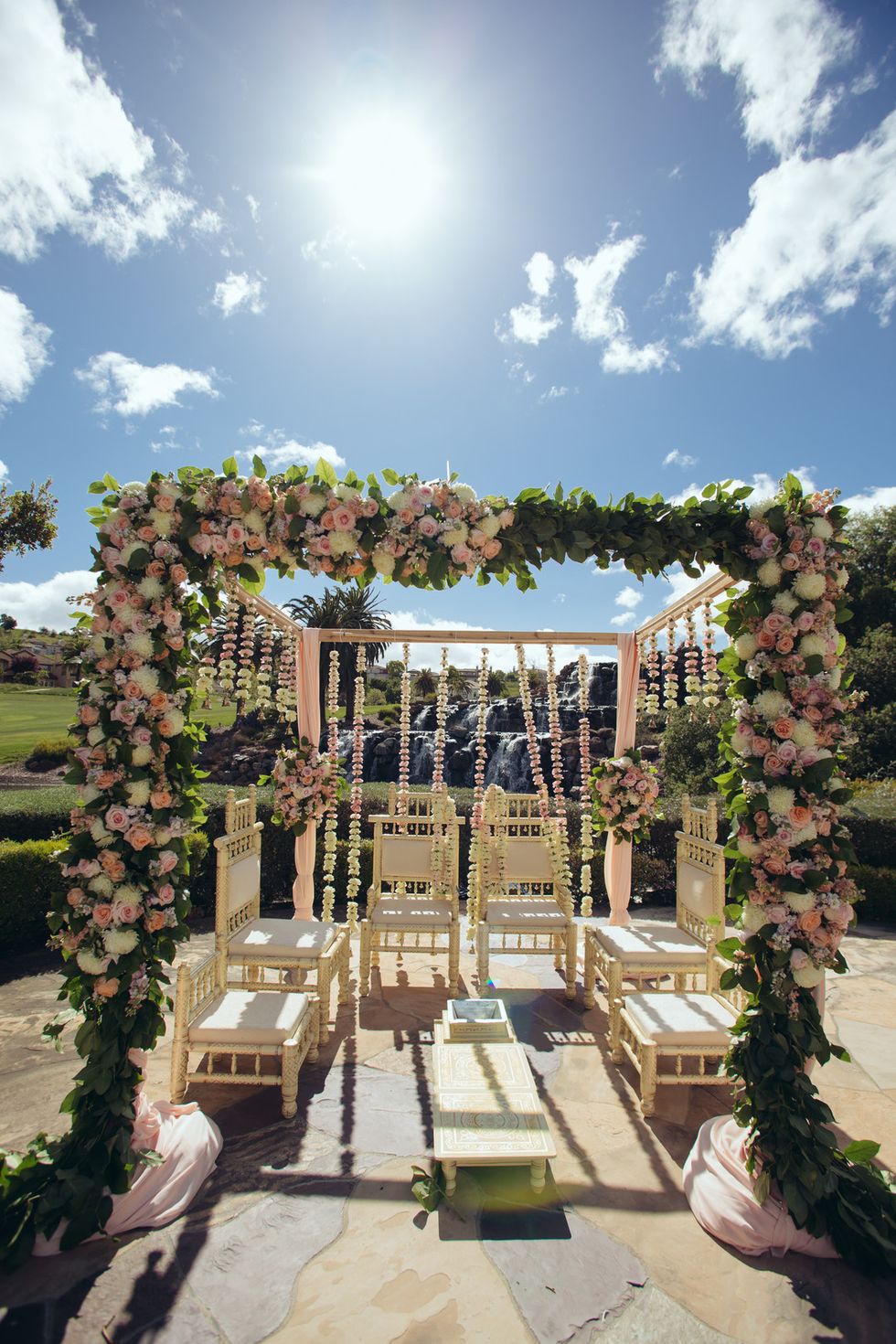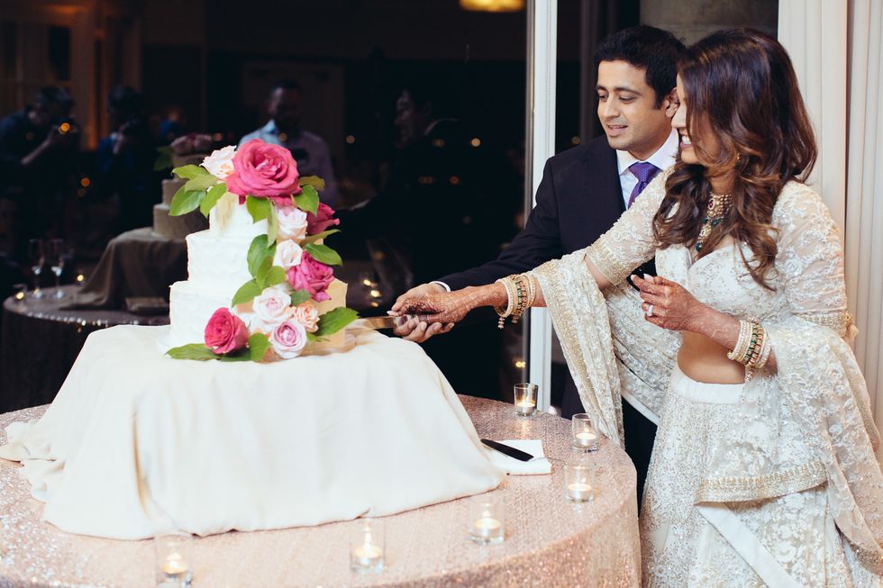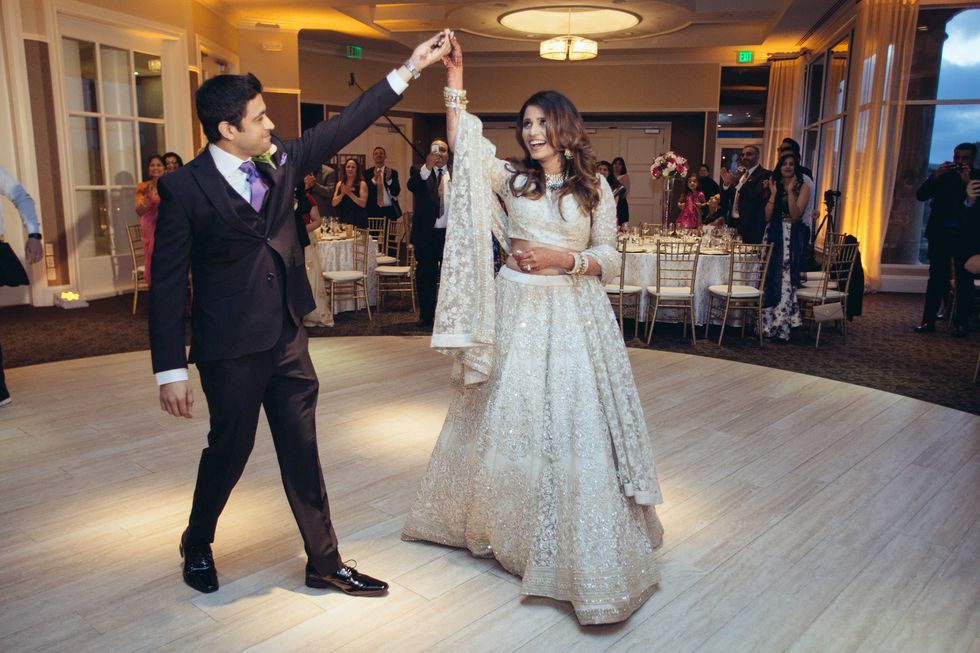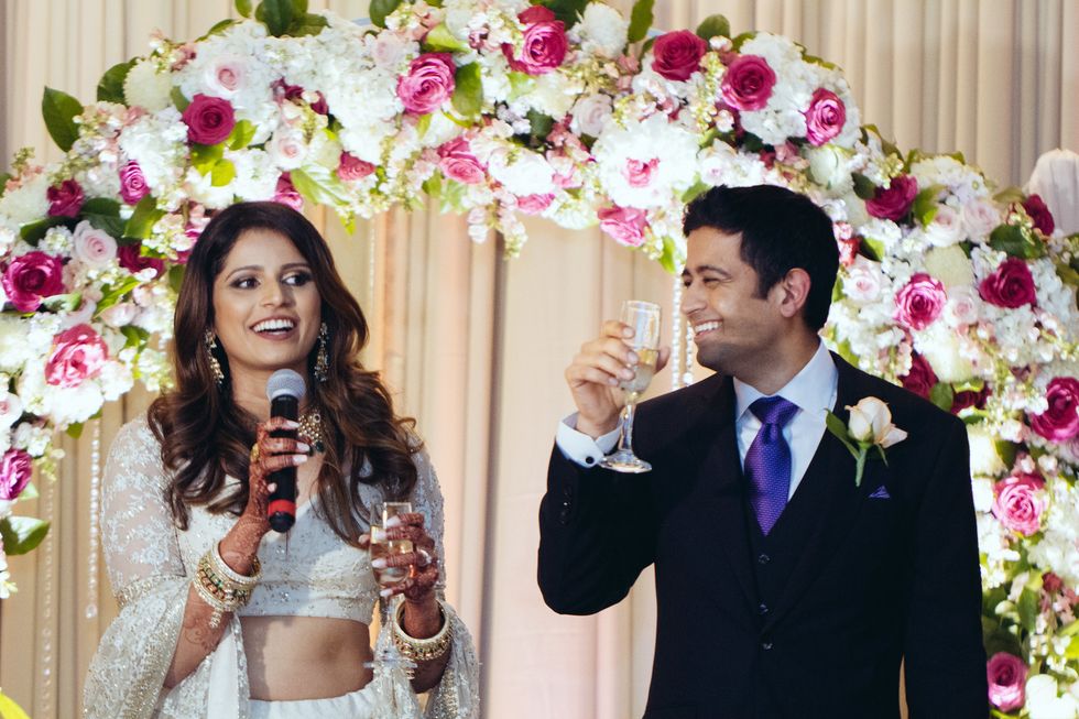 The ceremony began with a baraat, the groom on his decorated white horse as guests danced around him to the beat of an Indian drum. The couple exchanged flower garlands symbolizing their acceptance of each other before taking a seat under the mandap, a canopy covered in cream and blush blooms.