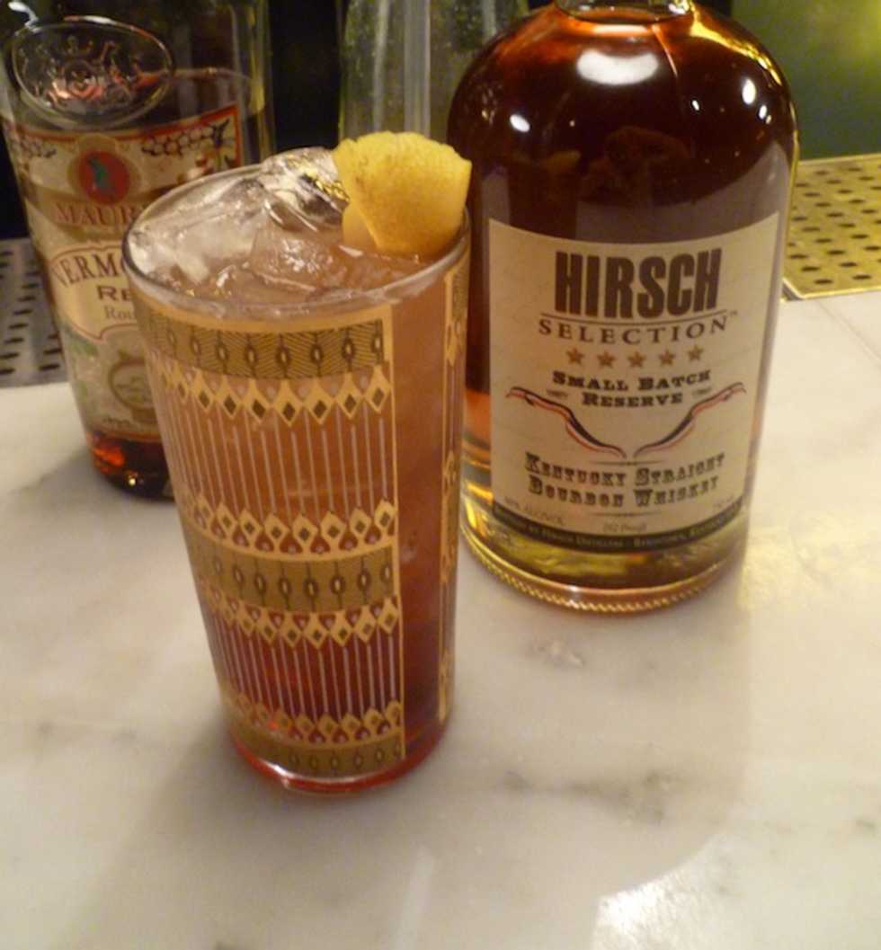 In this recipe, I have replaced the claret with the vermouth, which will concentrate on the bottom of the glass, as opposed to the classic presentation with the wine on top. To further tie in the ingredients, I replaced the simple syrup with an orange-scented maple syrup in order to marry the citrus peel in the Maurin with the woody maple flavor of the Hirsch. I think you should enjoy this tipple as I do, outside basking in the partly sunny San Francisco summer. Cheers!