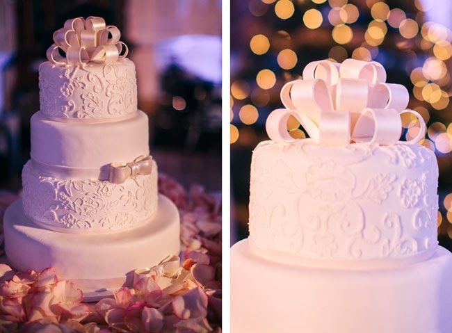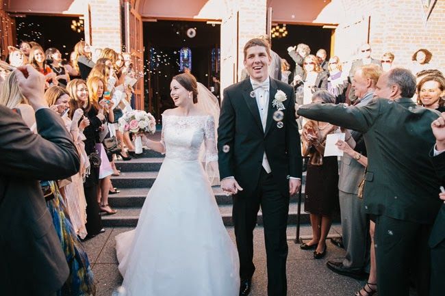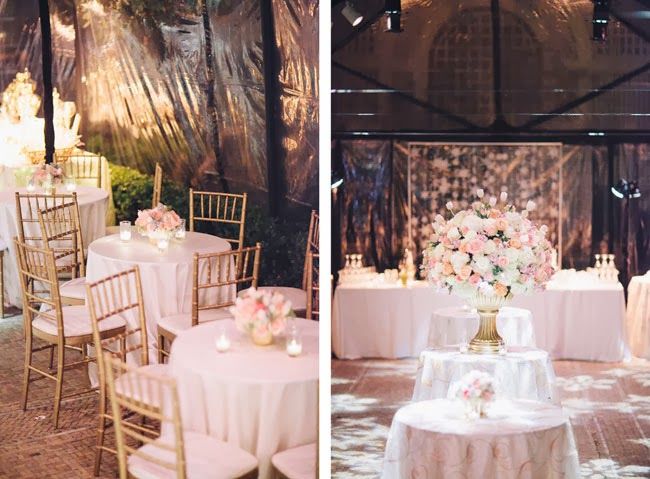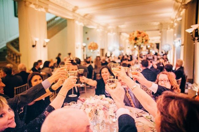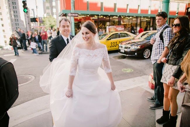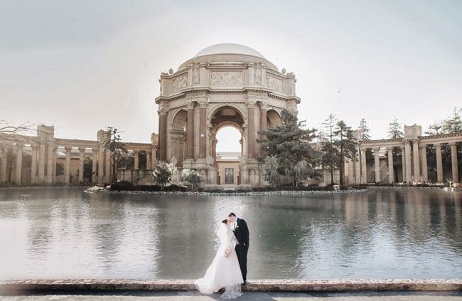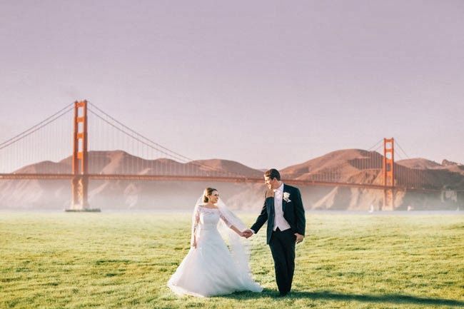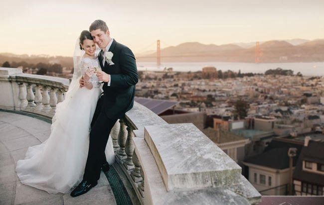 Their nuptials featured soft purple and pink colors and lots of colorful lighting including a large Christmas tree in the James Leary Flood Mansion. The bride looked beautiful in a lace gown by Jin Wang with sparkling bow-shaped earrings. The groom and his party looked dapper in their suits - with engraved flasks secretly stashed in every man's pocket. The couple made sure to snap shots at all of the city's most iconic locales.