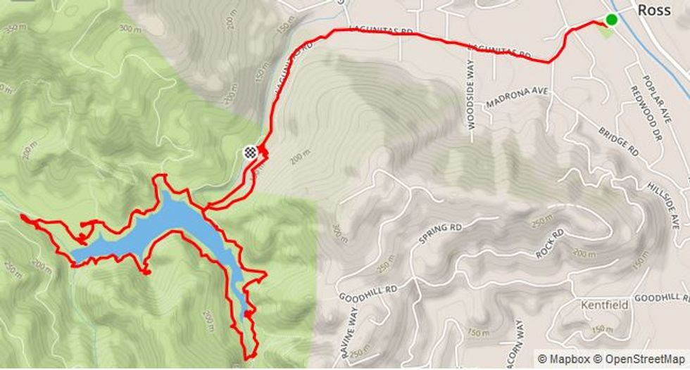 As parking on Lagunitas Rd. (past Shady Ln.) is limited or prohibited, an alternative is to park at Ross Town Center (the green dot on the map below) and walk from there, extending this hike to 5.8 miles.