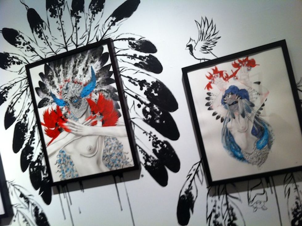 I told Brown I want her to paint one of my walls. Her work spreads beyond the canvas onto the surrounding white. Feathers, drips, bats, and birds extended the stylish spirituality. “The figures in my drawings for Undressed are based on supernatural beings, so I wanted my installation to look like a shrine. In Native American culture, feathers represent a connection to the spiritual world; an idea based on a bird's ability to fly to the Native Americans' concept of heaven. So I surrounded my pieces with feathers to suggest that idea.” Feather hair extensions? Feather art? Birds of a feather flock together...