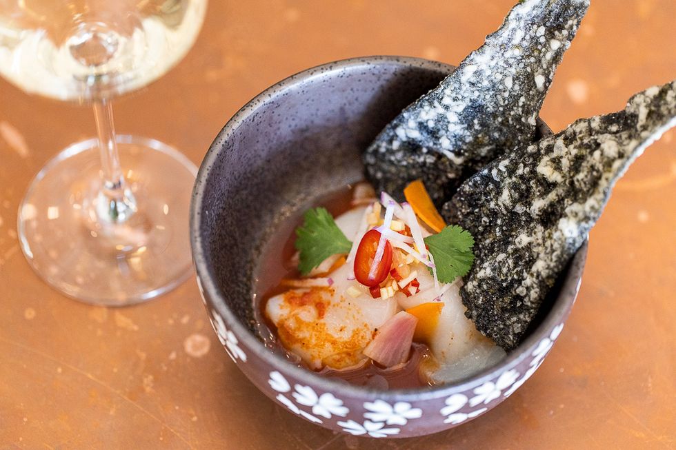 The scallop ceviche is a well-balanced, light bite with a few slices of spicy chile, pickled shallots for a hint of acid, and crunchy nori chips.
