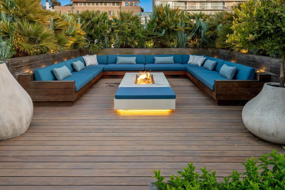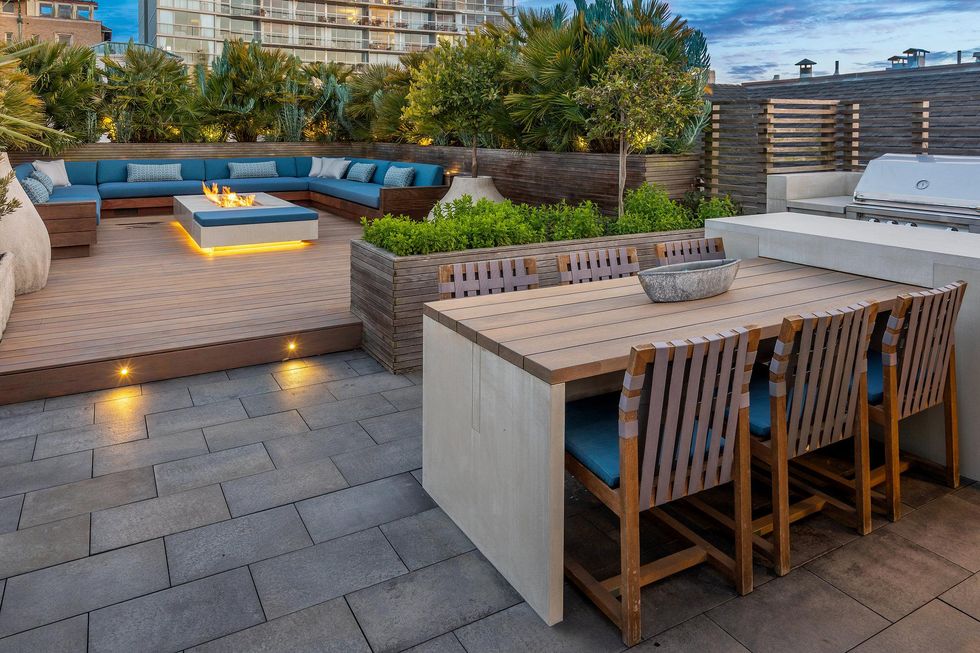 Upstairs is where the party is, with indoor/outdoor living really coming into play—think floor-to-ceiling sliding glass doors and a sitting room with a wet bar that transitions onto the private rooftop deck. With its own dining space, two seating areas, two fire tables, a hot tub, and killer views, you may never go inside again.