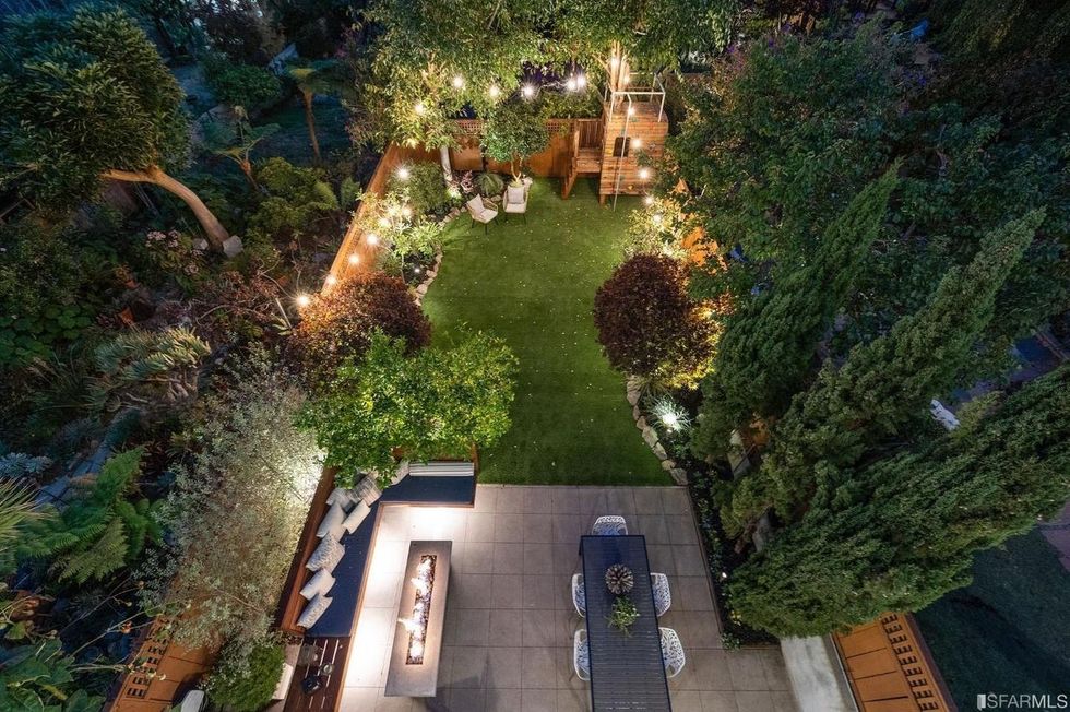 On the ground floor, find another bedroom or office suite with its own full bathroom and walk-in closet plus access to the garage. Down another level sits an additional bedroom and bathroom, plus a utility room. The backyard has a patio with a gas fire pit, built-in ipe wood benches, and a tree house.