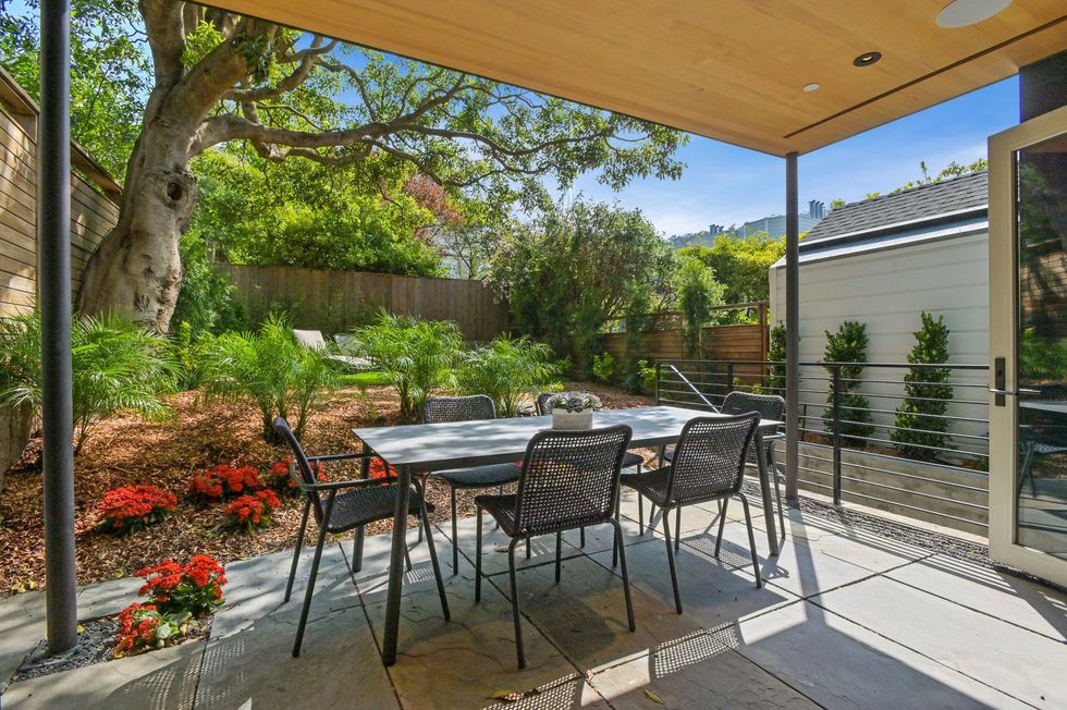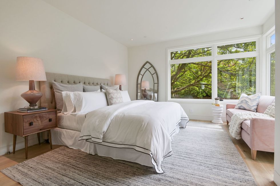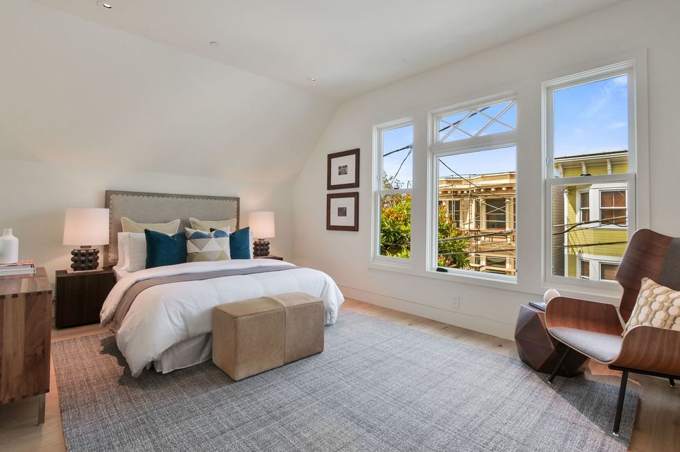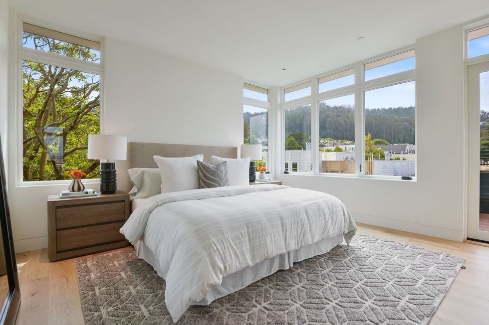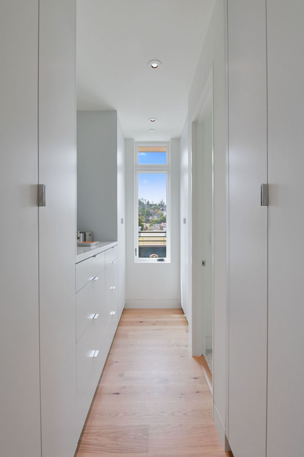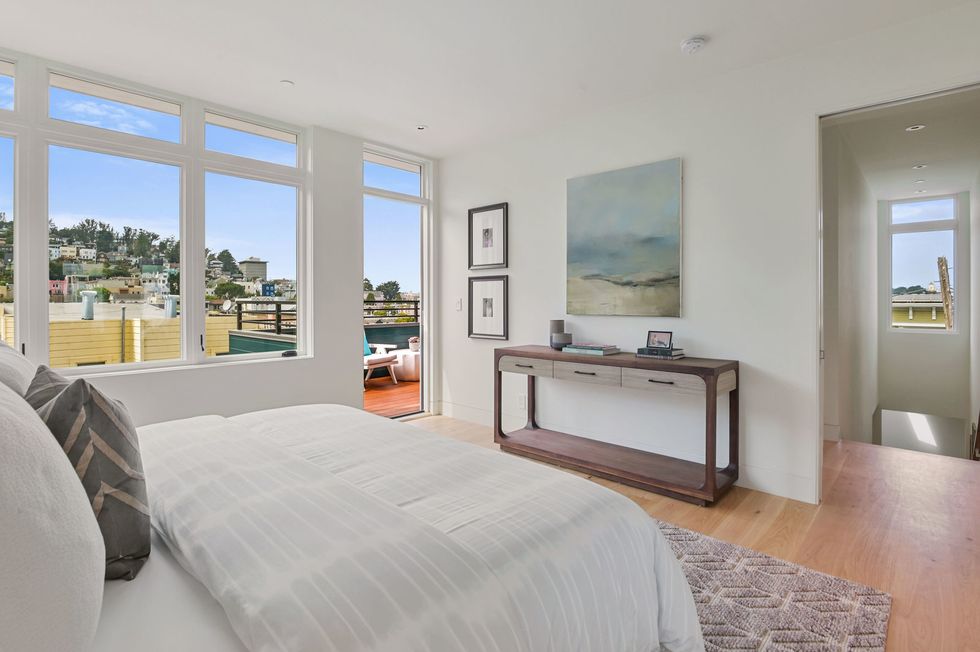 As it should, the private master suite crowns the home on the top floor with covetable views of Sutro Forest and the mount's iconic tower. Step out onto the deck for a panorama of the city skyline including the Golden Gate Bridge and steeples of St. Ignatius Church. The walk-in closet, with oodles of built-in storage, is a dream for getting dressed; the master bath has modern-zen vibes with a soaking tub beneath the treetops.