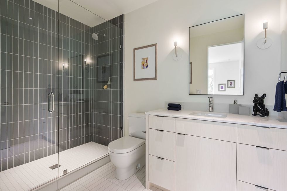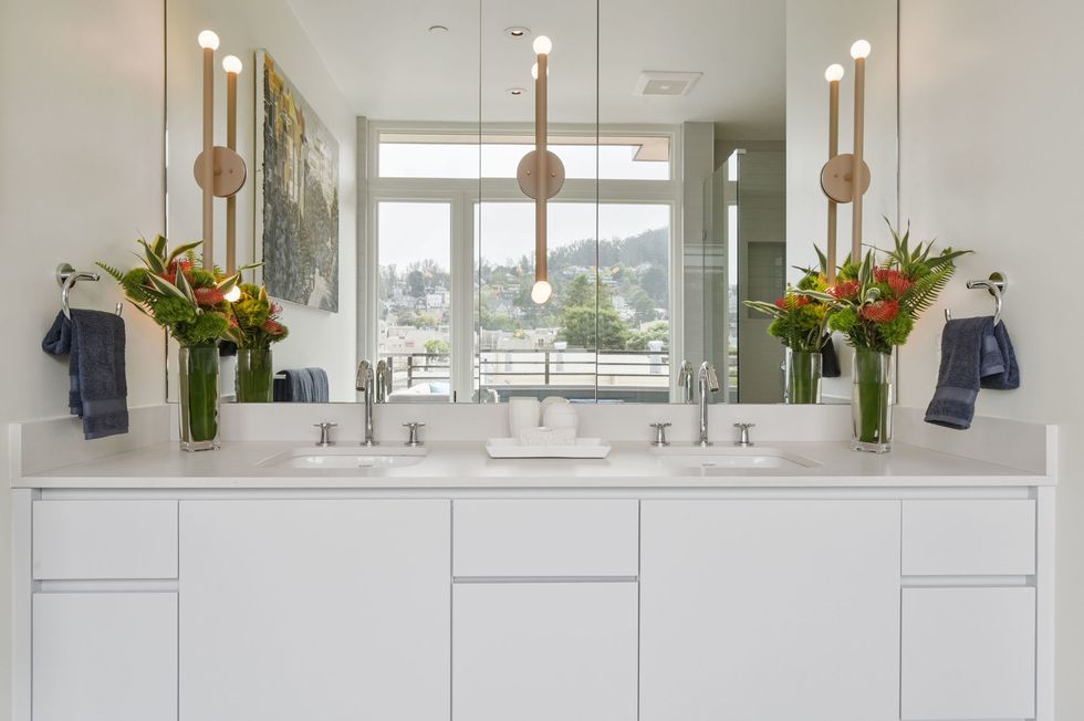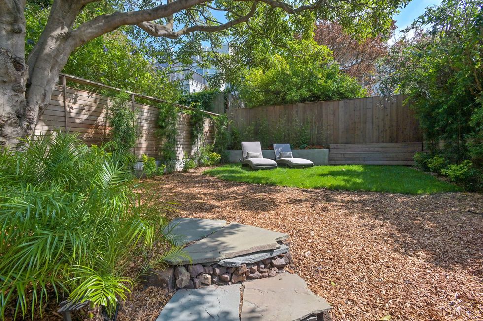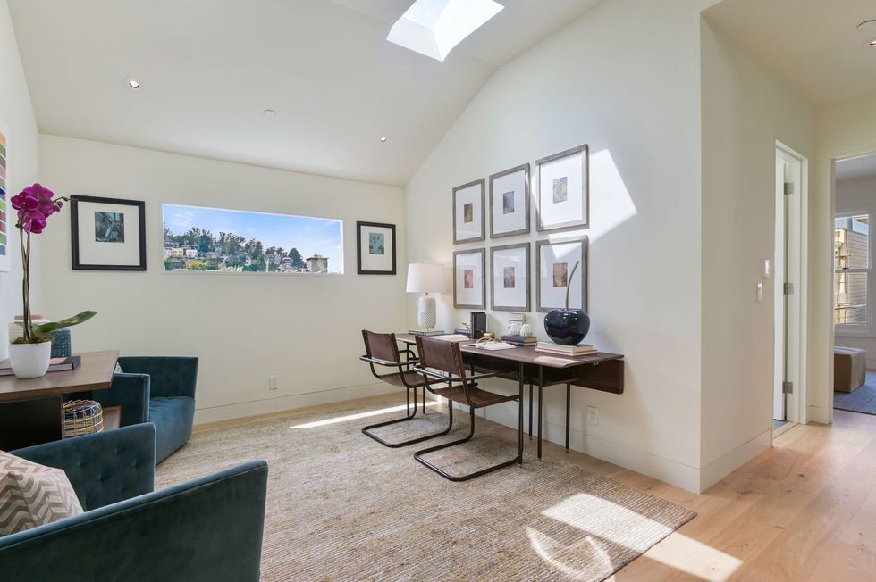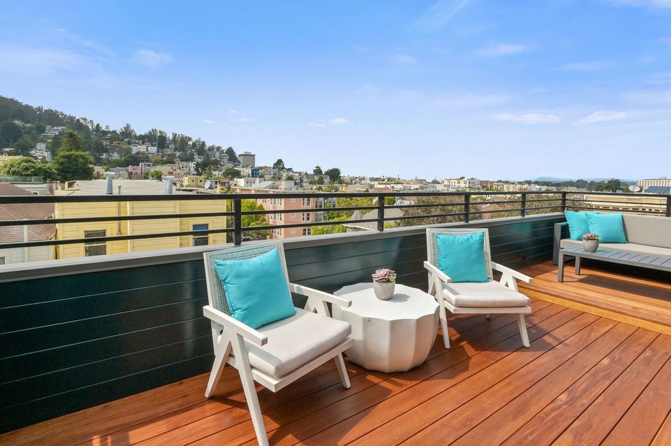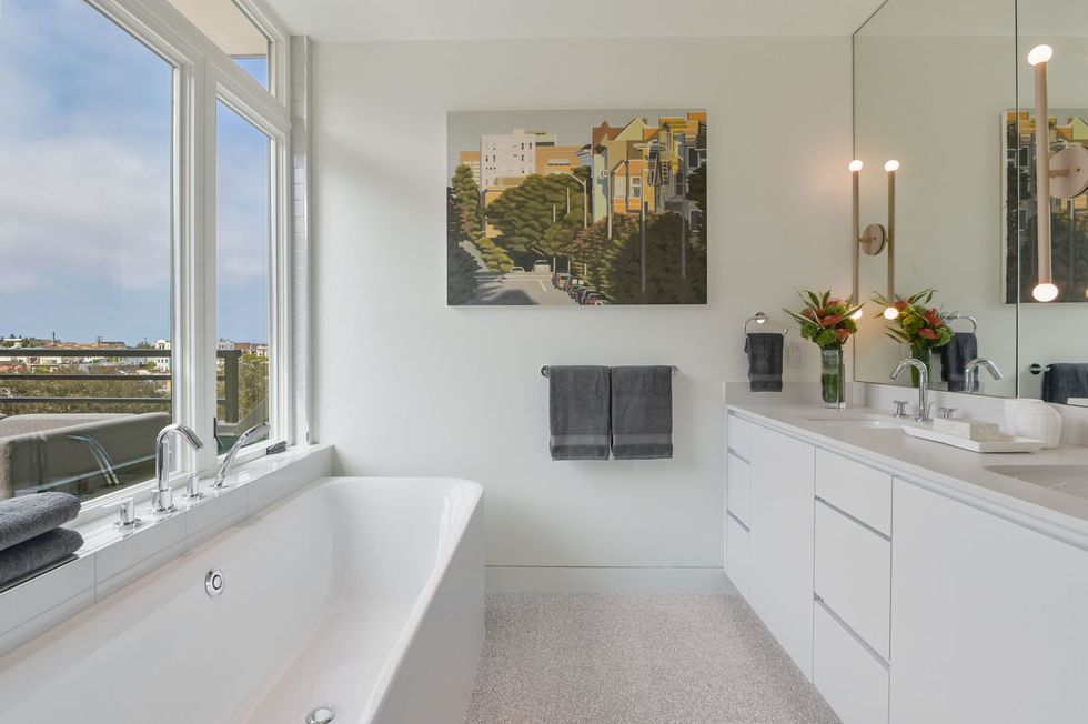 As it should, the private master suite crowns the home on the top floor with covetable views of Sutro Forest and the mount's iconic tower. Step out onto the deck for a panorama of the city skyline including the Golden Gate Bridge and steeples of St. Ignatius Church. The walk-in closet, with oodles of built-in storage, is a dream for getting dressed; the master bath has modern-zen vibes with a soaking tub beneath the treetops.