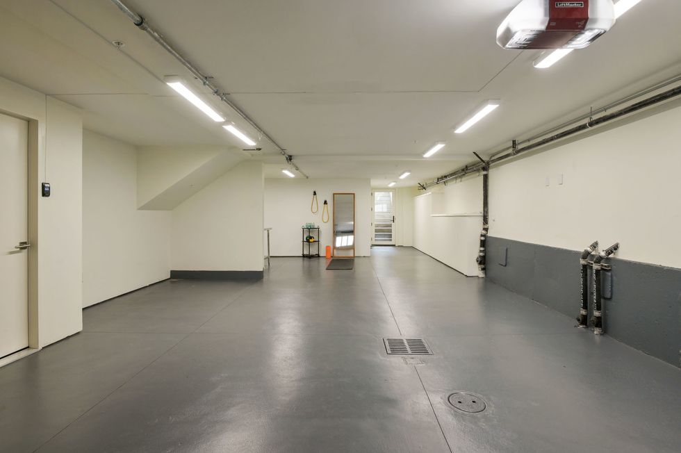 Designed for lounging and mingling, the great room has a chef's counter view to the kitchen, distinguished by its oversized island of white ash cabinetry, sleek Wolf double ovens, Bosch dishwasher, and Sub-Zero refrigerator and wine storage. A wall of glass encourages the party to spill outside for cocktails or sunbathing in the sheltered garden. A roomy half bathroom with a floating marble vanity rounds out the main floor.