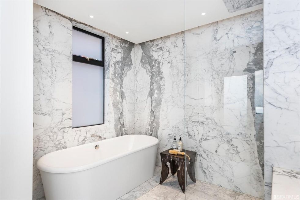 The four-story primary residence holds five bedrooms and six bathrooms at just over 5,100 square feet. Here, rift cut white oak floors lend a soothing canvas for luxurious finishes like the Calacatta marble island in the kitchen; a floating wall-mounted bench in the open dining area; and a modern marble fireplace in the living room. The bathrooms are also swathed in contemporary marble.
