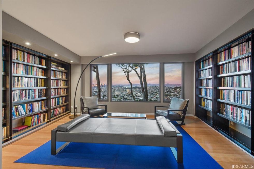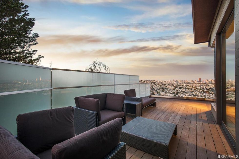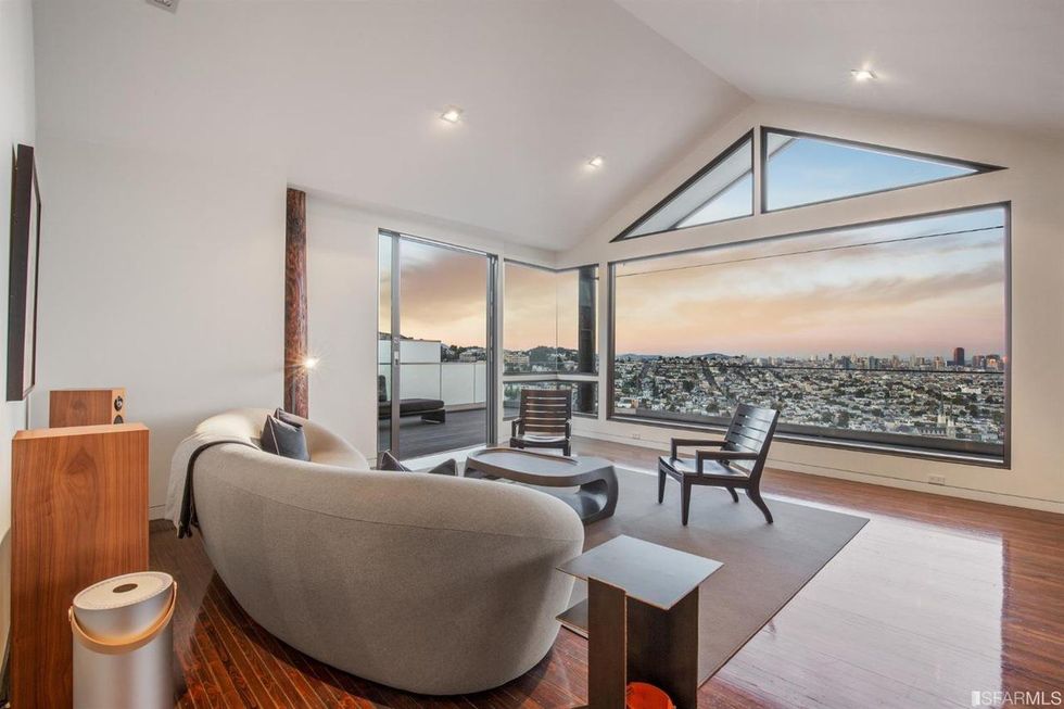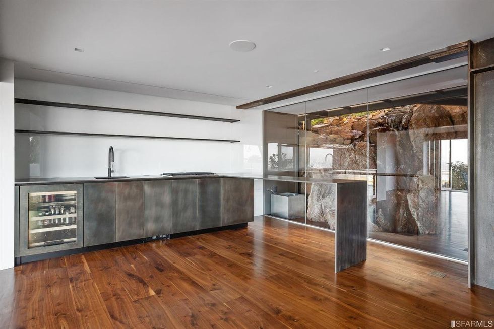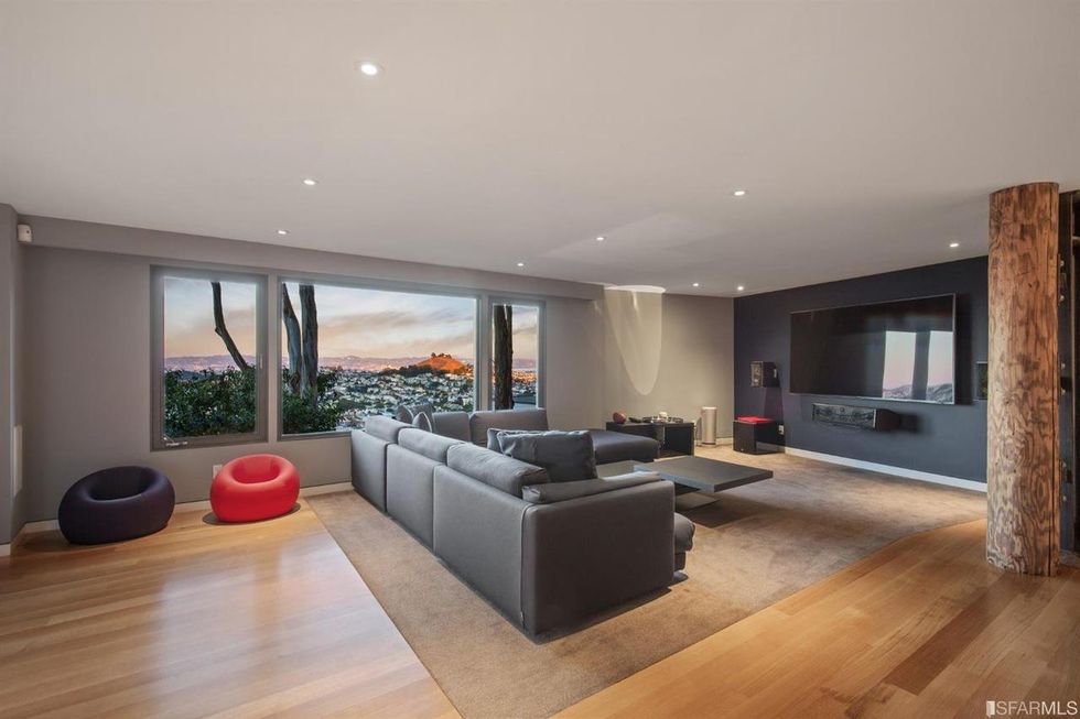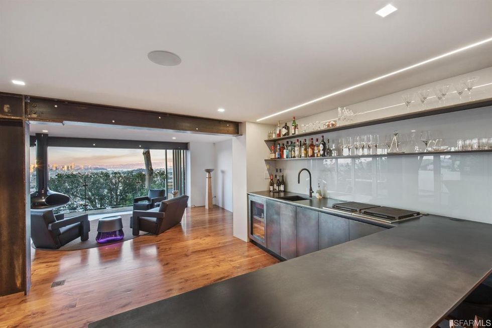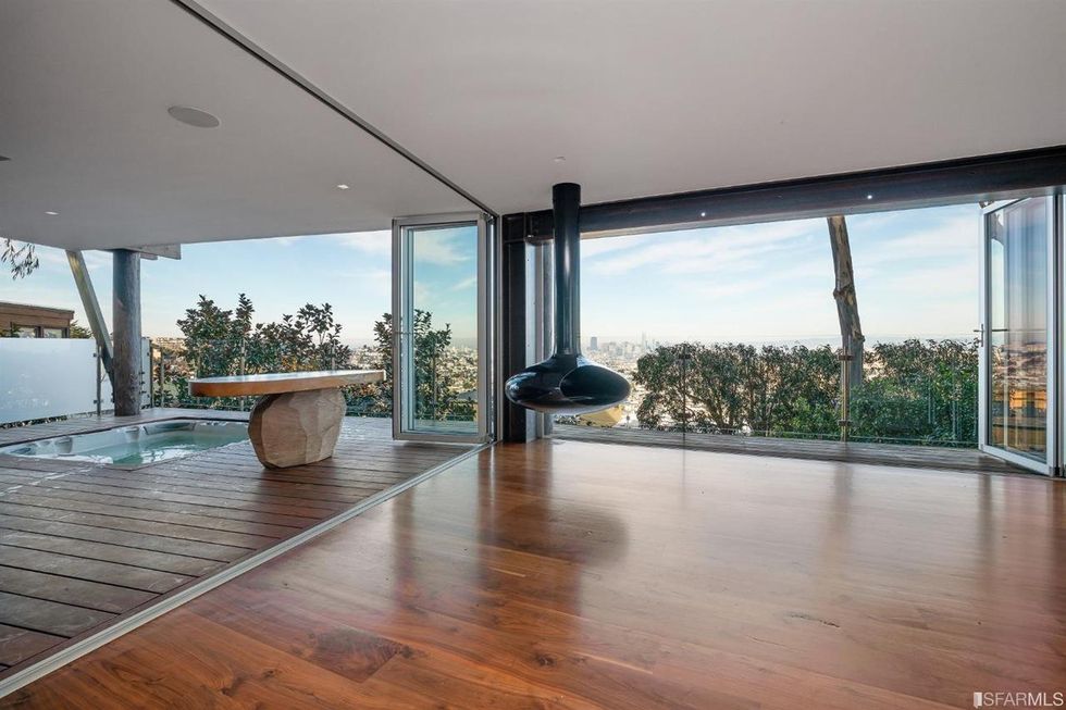 Originally built in 1971, the midcentury-modern house, appearing as a simple one-story from the curb, rather surprisingly opens up into a fully contemporary residence with indoor/outdoor spaces and amenities—including a home gym and a hot tub with views of downtown San Francisco—spanning more than 6,000 square feet across four stories.