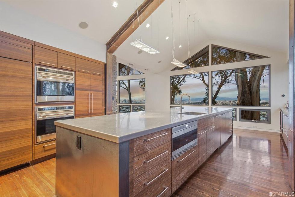 Enormous, arched windows and skylights flood the open living and dining rooms and kitchen with natural light and vistas both urban and wooded (there's even a picturesque babbling brook!), creating an earthy-meets-metropolitan vibe echoed inside via lots of wood and stainless steel. Practical design elements include lots of built-in storage, while a party mentality has definitely informed the rest of the plan: The main kitchen has updated appliances, two sinks, and an oversized island, plus easy access to a large deck for drinks in the foreground of the city skyline.