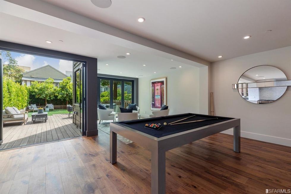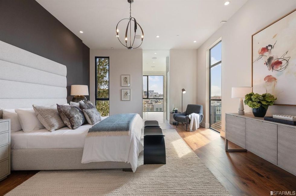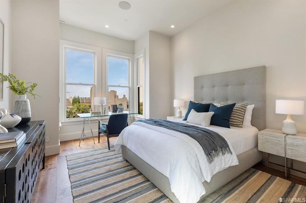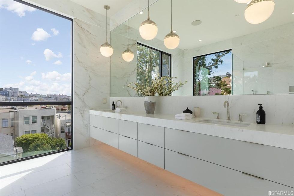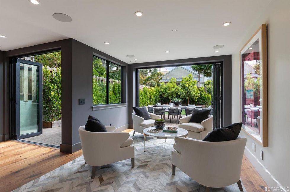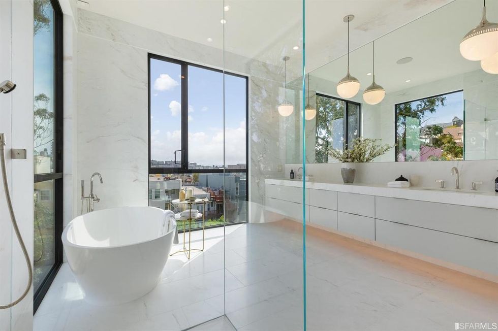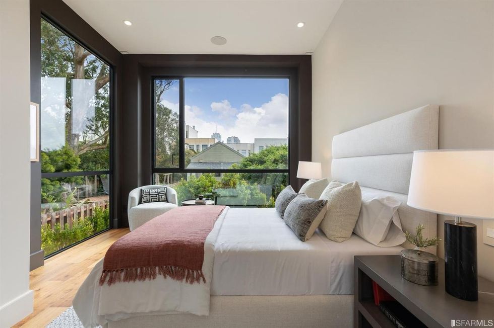 The master suite on the top floor also has sweeping windows and a spacious bathroom with a soaking tub, double shower, and a long floating marble vanity with two sinks. A garden-facing media room, multiple flexible-use rooms, two laundry rooms, and spacious storage closets round out the interior. There are walnut floors throughout. Luxe amenities include radiant heat flooring, Nest thermostats, designer lighting, and a two-car garage.