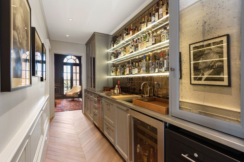 The front of the home is characterized by glamorous entertaining spaces: a living room with south- and west-facing French doors that open to Juliet balconies; a sexy dining room with custom wax-striated blue-gray paint and platinum-leaf detailing; and an additional sitting room with an adjacent bar, accented by smoky mirrored cabinets and fully equipped with a Perlick wine refrigerator, ice maker, and shelving for bottles and barware.