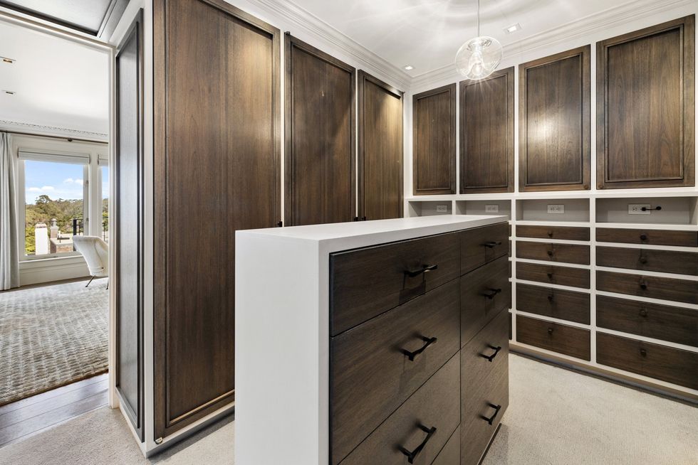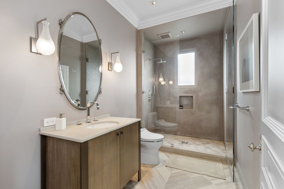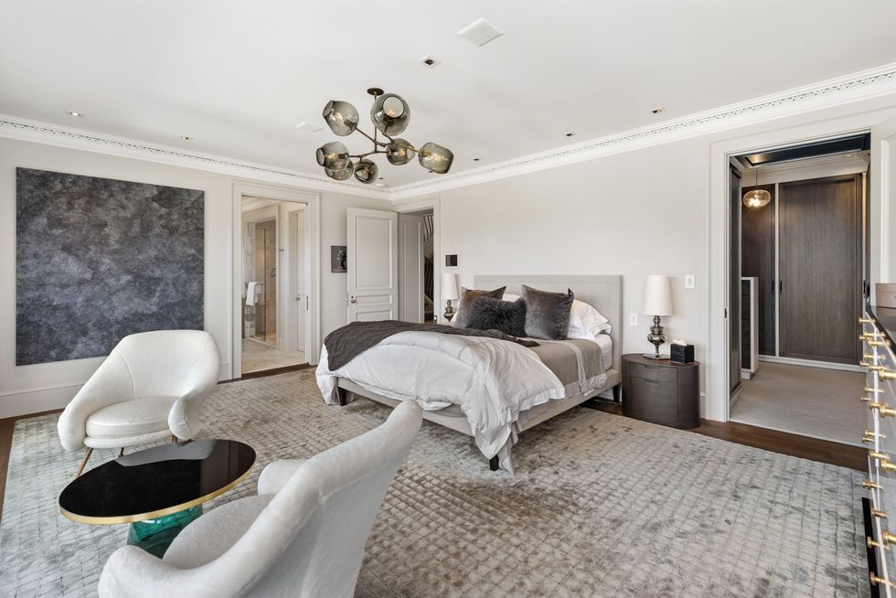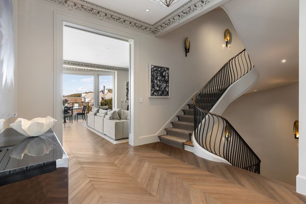 Off a formal entryway, the main level is a showplace of design delights including fumed French white oak herringbone floors, a grand curved staircase with handcrafted bronze railings, and rich walnut-paneling in the library. "There are many spectacular details, but the ornate crown molding on the main level is quite extraordinary," Hatvany adds.