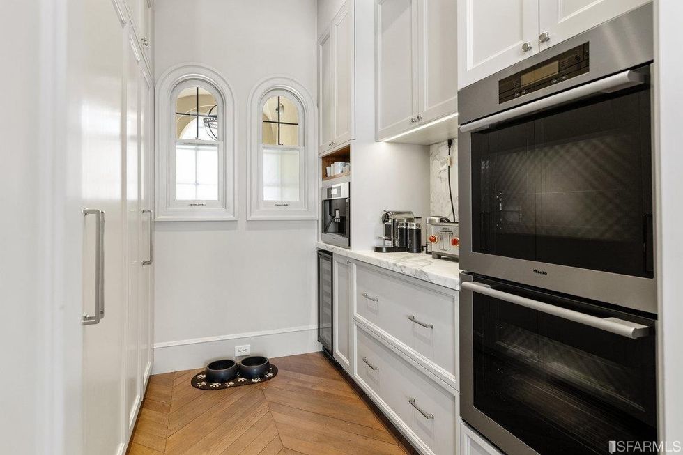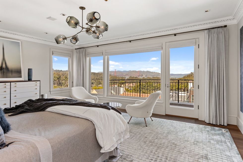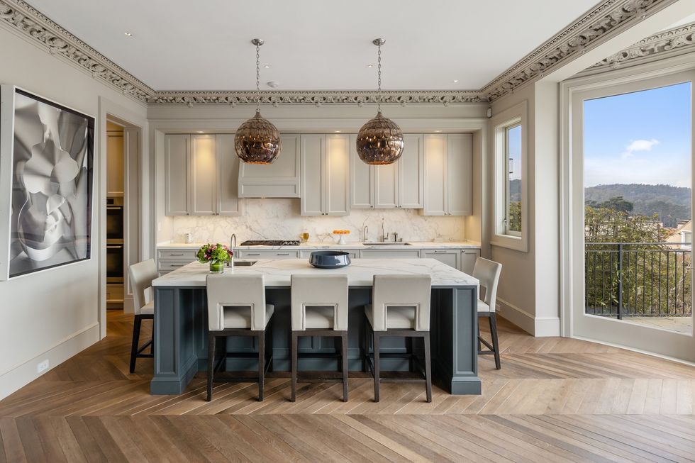 Door and window heights were raised, an elevator was added, systems were upgraded, and even the garage was relocated, but the bones of the home were kept in place. Emphasis remains on original wood details, high ceilings, and views of the Presidio and San Francisco Bay. The result is a fusing of traditional and contemporary.