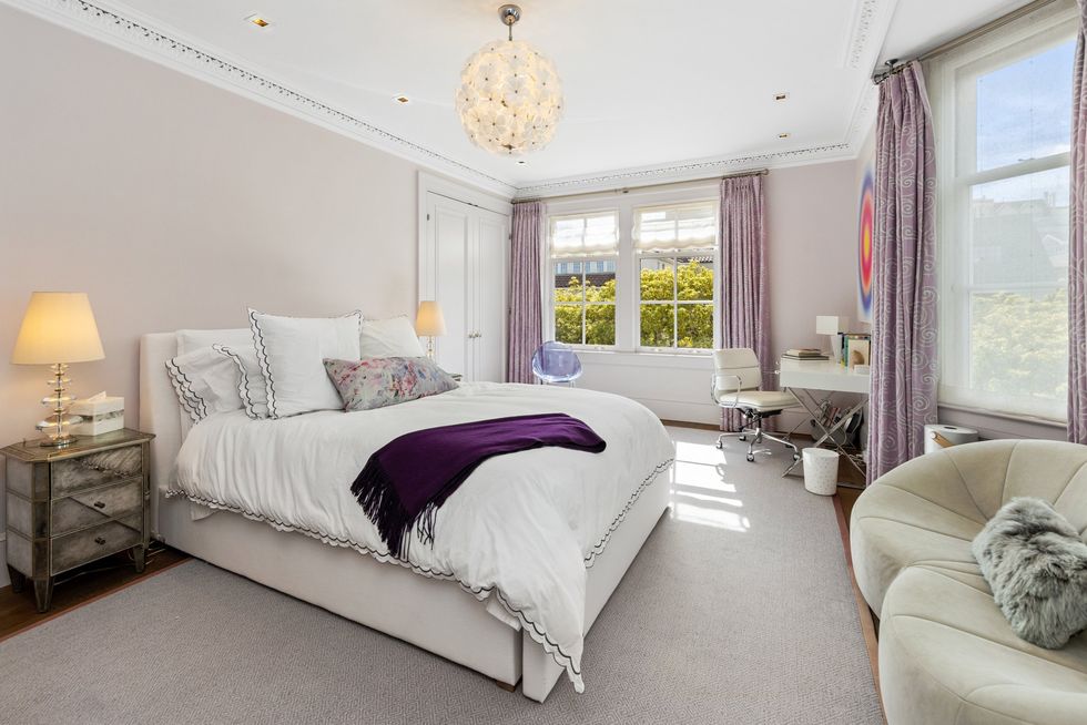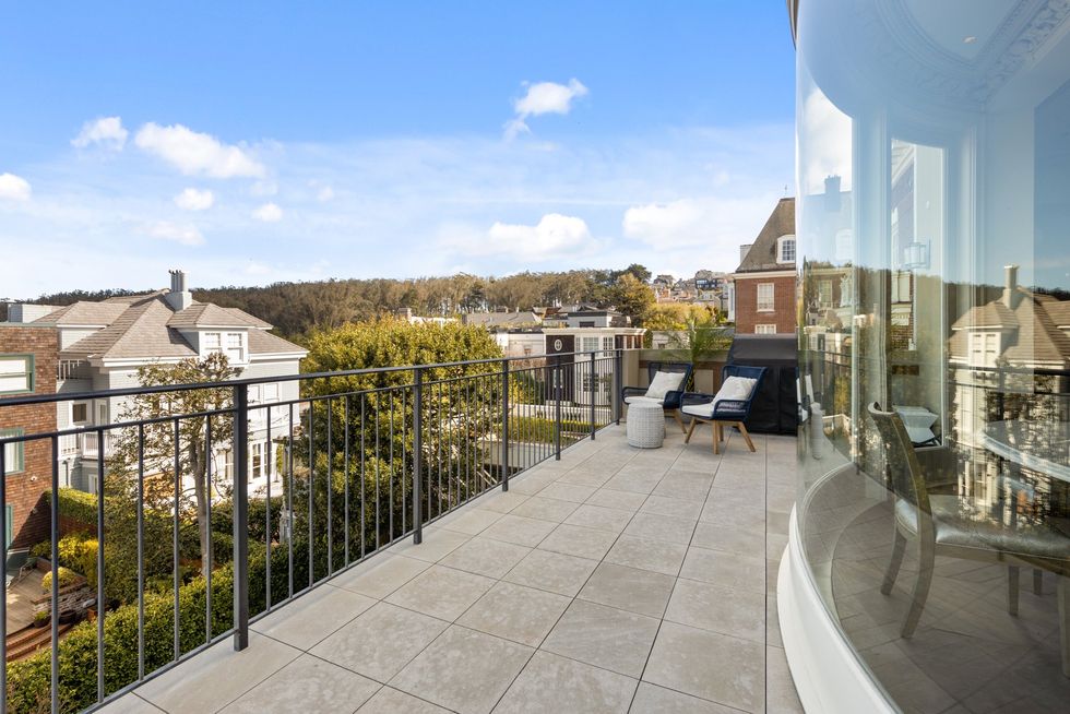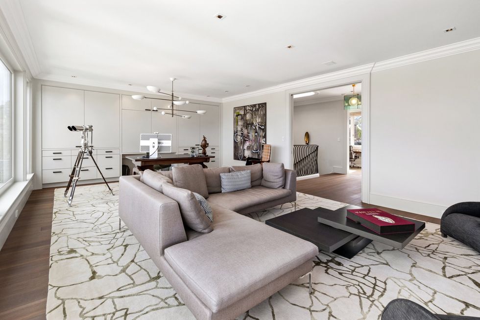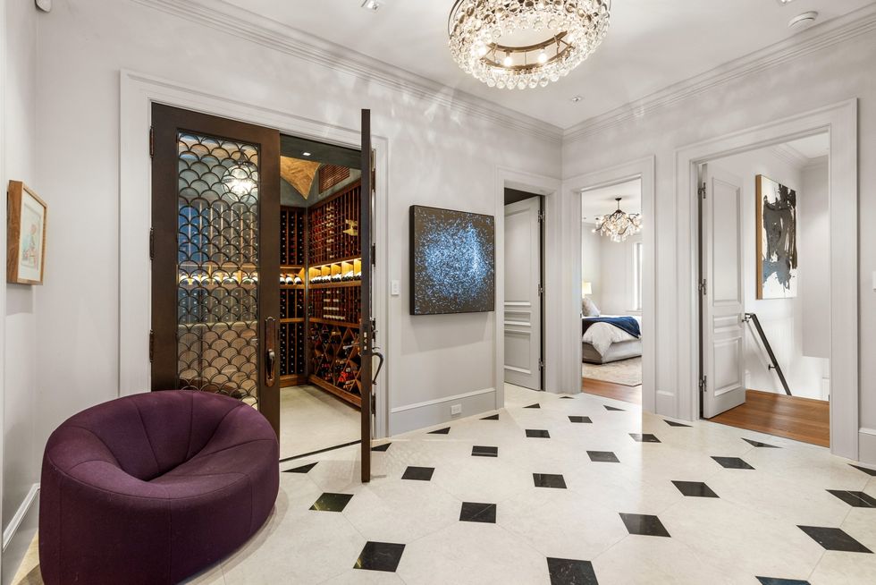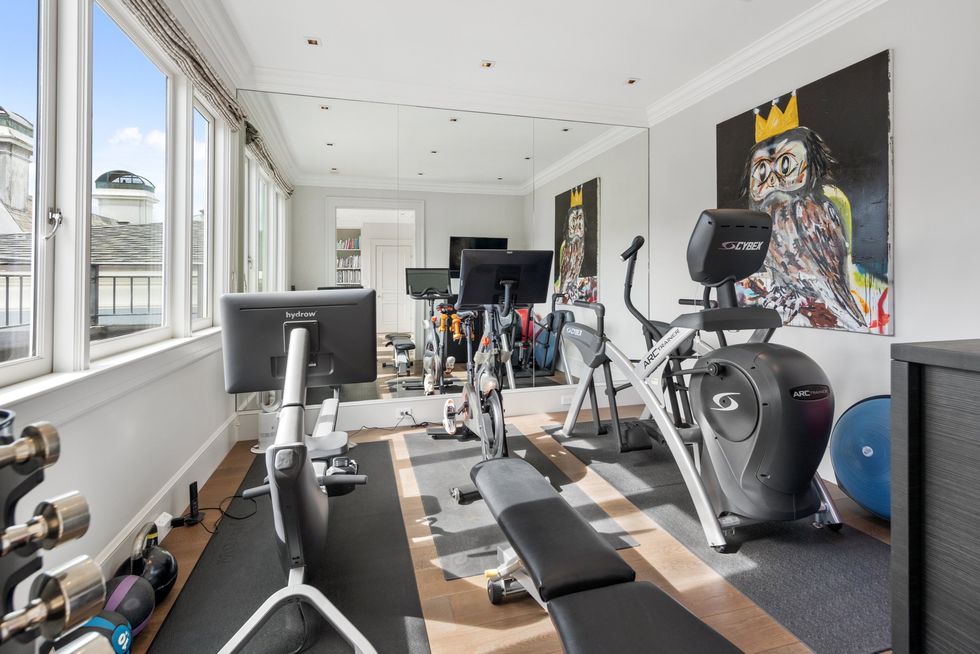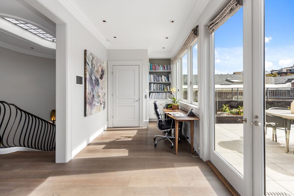 On the top floor, a leaded skylight and a circular window permeate the stairwell and landing with natural light. An airy feel continues throughout, with several picture windows in an additional family room. Built-in cabinets offer storage, while an integrated wet bar and another wine fridge promise easy entertaining or lounging with the family. A home office, gym, and sprawling roof terrace complete this floor.