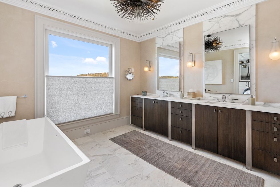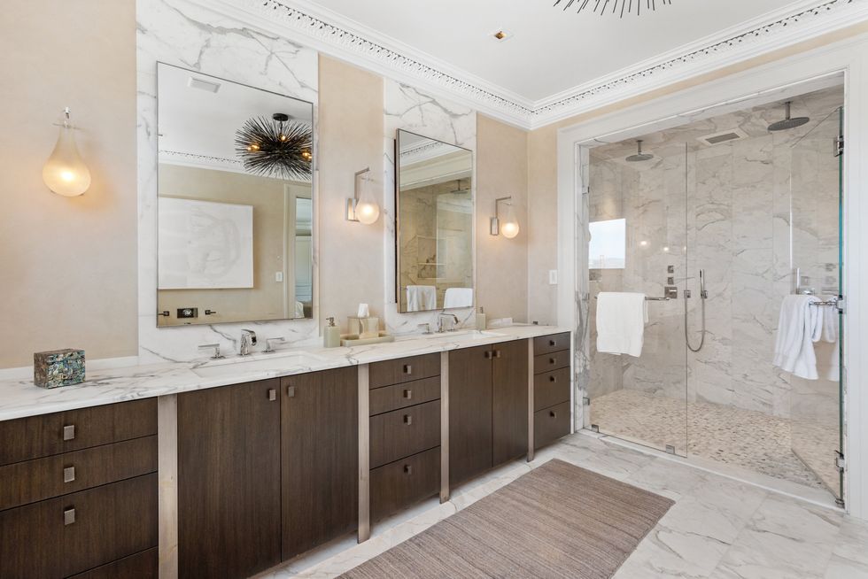 Upstairs, an entire level is devoted to private quarters with five bedrooms in all, plus a laundry room and closets. The primary suite has its own sitting area and terrace; a walk-in closet with a center island and custom shelving; and a large, spa-like bathroom with marble floors, a marble-topped double vanity, glass rain shower, and an extra-long soaking tub that enjoys those requisite views.
