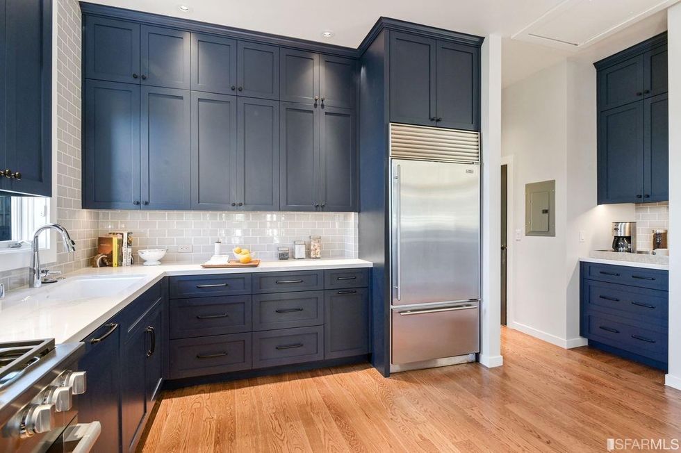 With box beam ceilings, the formal dining room sits alongside the recently remodeled kitchen where deep blue cabinetry and gray subway tiles keep the feeling warm and interesting. There are marble countertops, a coffee bar, and stainless steel appliances including a Miele range and hood.