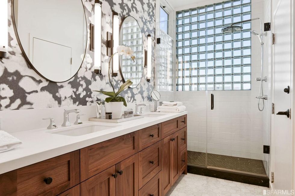 The home has just two bedrooms but each has hotel vibes. The master suite is romantic with a private sitting room with a marble fireplace, double walk-in closets with built-in shelving, and a bathroom with a dual-sink vanity and whimsical floral wallpaper. The second bedroom also has an en suite bathroom with a soaking tub.