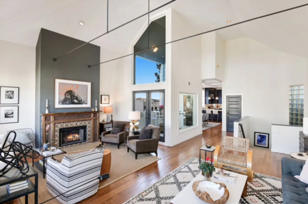 A spacious common area with dramatic vaulted ceilings houses a living room large enough for two dedicated sitting spaces, including one with an intricately carved fireplace. Two sets of bay windows and a skylight infuse the room with natural light. A glassed-in deck with downtown and peek-a-boo water views seems to float between the living space and the dining room.