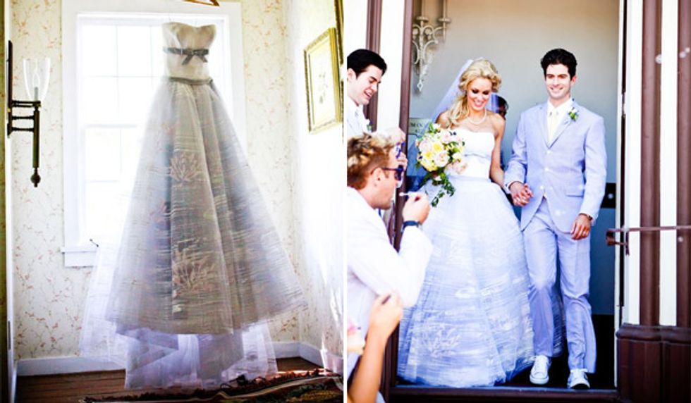 The event was both casual and glamorous. In the casual category, the groom and his groomsmen wore cotton seersucker suits and Converse sneakers (“They wanted to feel comfortable,” says the bride); the tables were set with a mix-and-match of vintage plates gathered from around the country; and after the ceremony, many of the guests kicked off their dress shoes and donned flip flops.