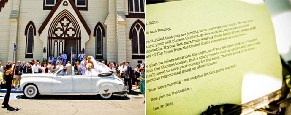 After the vows were exchanged, the bride and groom hopped in a vintage auto for the trip to Shady Oaks, where rustic tables laden with Napa-style food, flowers, and wine awaited them. A note in a period typewriter instructed the guests to shed their shoes and don the flip-flops, as a night of revelry awaited them.