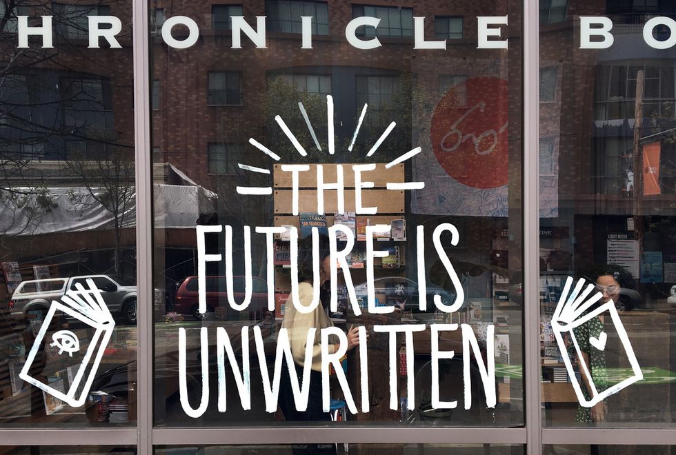 Other shop windows will read "Love Wins" (at Picnic on Polk Street) and "The Future is Unwritten" (at Chronicle Books on Second Street).