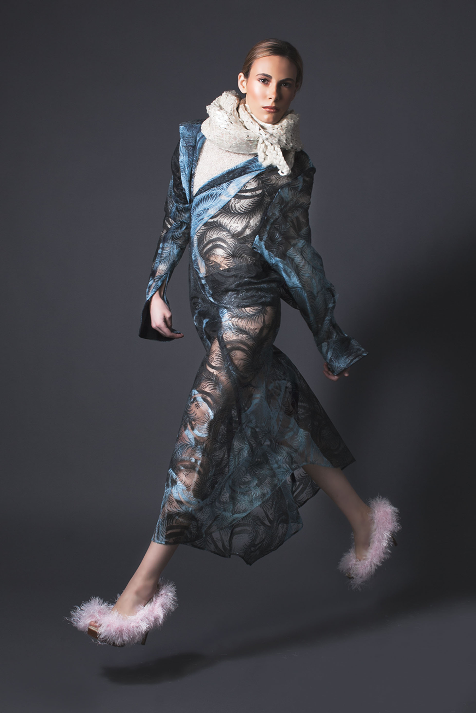 Look 1: White thick-knit metallic scarf, H&M, $20. White pile-knit acrylic sweater, $18, H&M, h&m.com. Charcoal & Navy long lace dress, designed by Wen_Lin Lina Tsai. Blush fur pumps, stylists own.