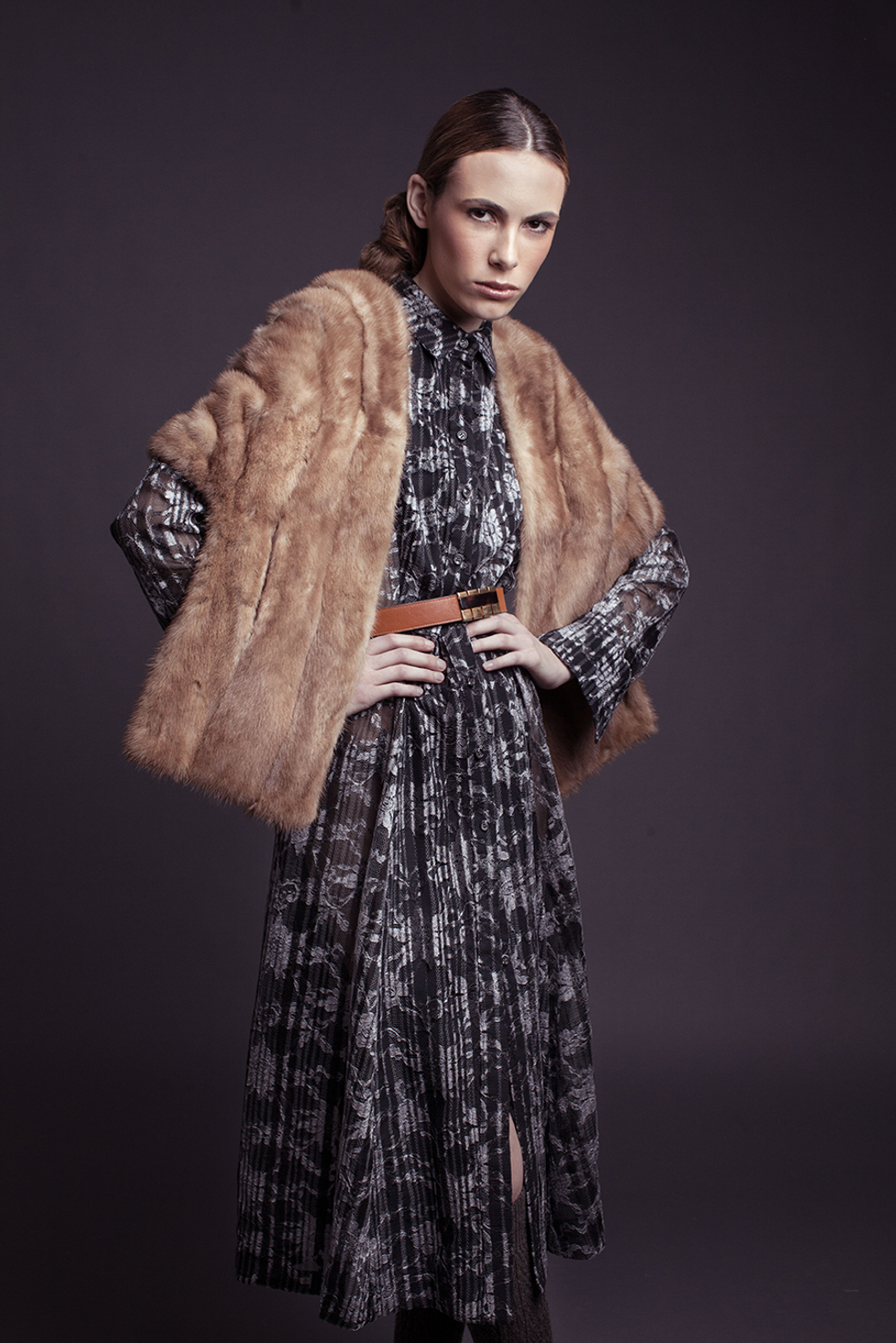Look 2: Blue floral lace dress, designed by Erica Laba.Vintage light brown leather belt with conch shell closure, stylist’s own. Vintage fur shawl, stylist’s own. Dark grey knee-high socks, $12, H&M. Light leather lace-up booties, stylist’s own.
