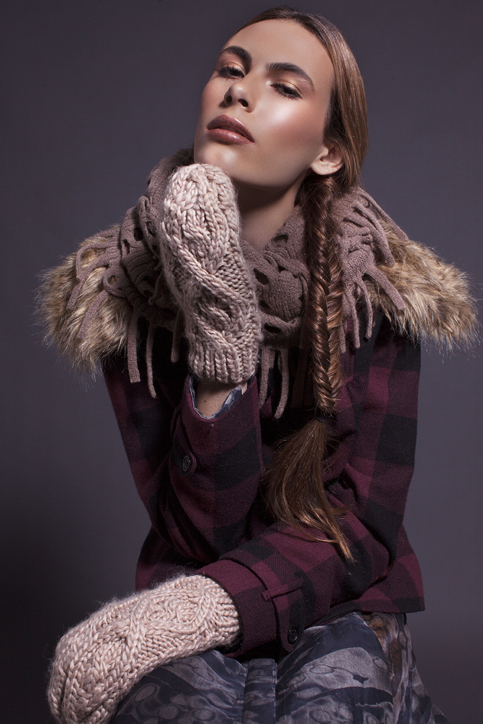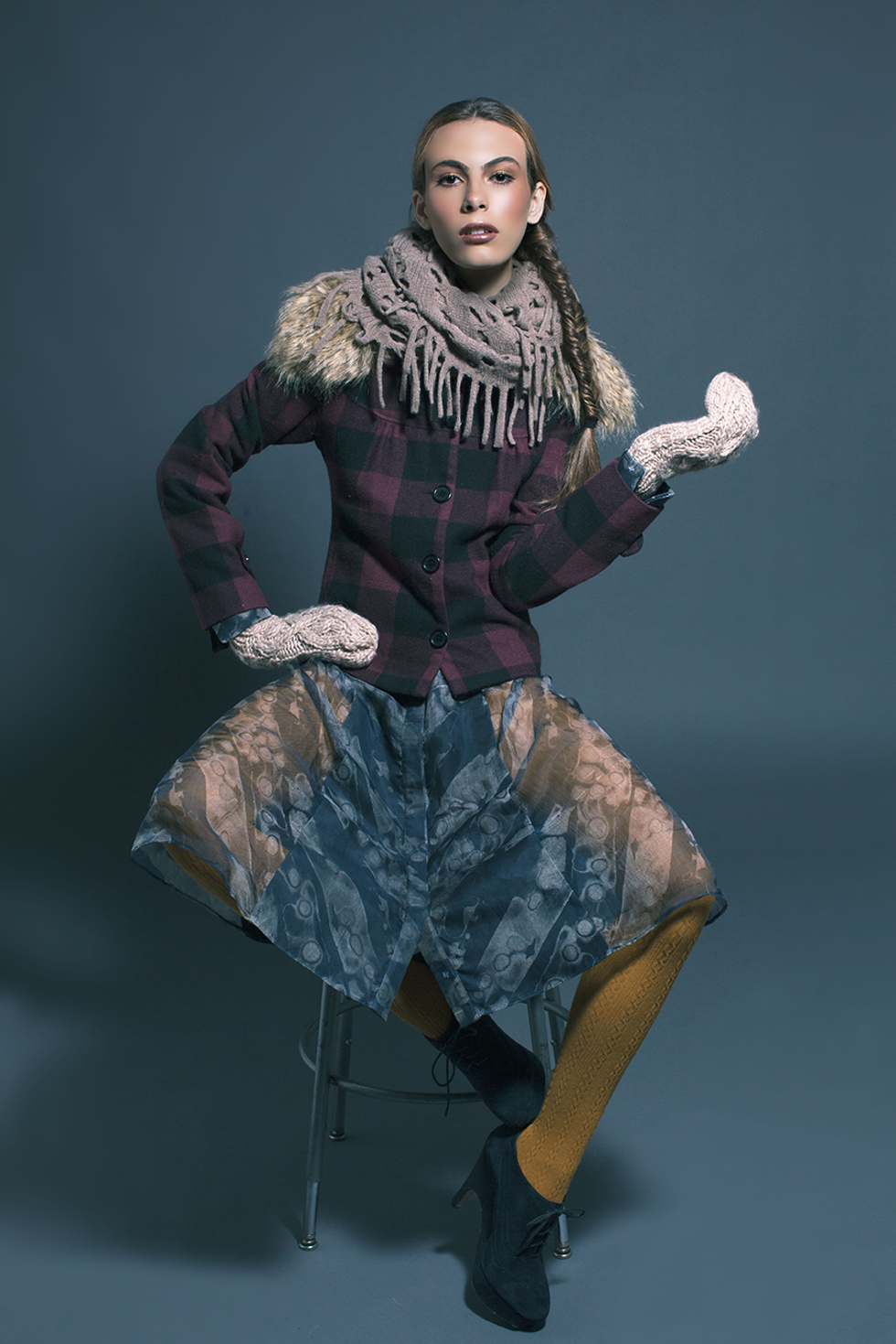 Look 4: Chestnut knit scarf with fringe details, stylist’s own. Fur collar detail, $8, H&M. Crimson & charcoal wool plaid jacket, $25, Forever 21, forever21.com. Beige wool mittens, $12, H&M. Navy & Grey pleated chiffon dress, designed by Erica Laba, Liza Quinones & Emma Mengchen Yang. Canary knit tights, $12, H&M, h&m.com. Navy oxford booties, Dolce Vita, stylist’s own.