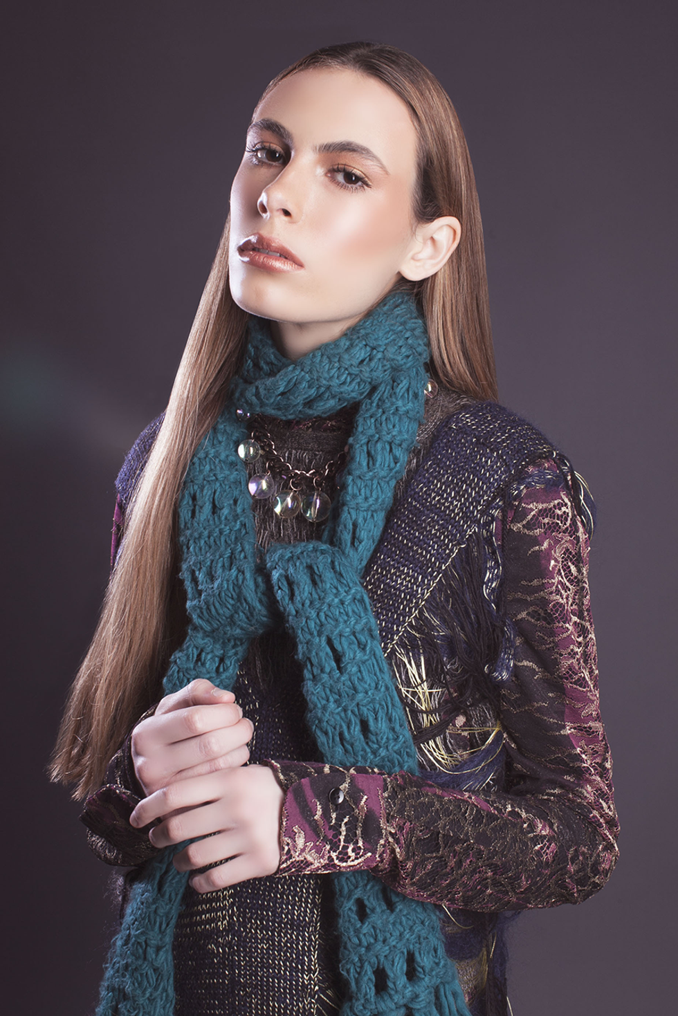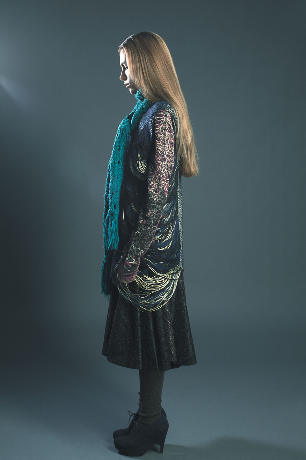 Look 5: Brocade lace dress,vdesigned by Angela Sison. Blue & yellow fringe knit sweater, designed by Candice Ma. Aqua scarf, stylists own. Bronze chain statement necklace with clear ornaments, $17, H&M. Dark grey knee-high socks, $12, H&M. Navy oxford booties, Dolce Vita, stylist’s own.