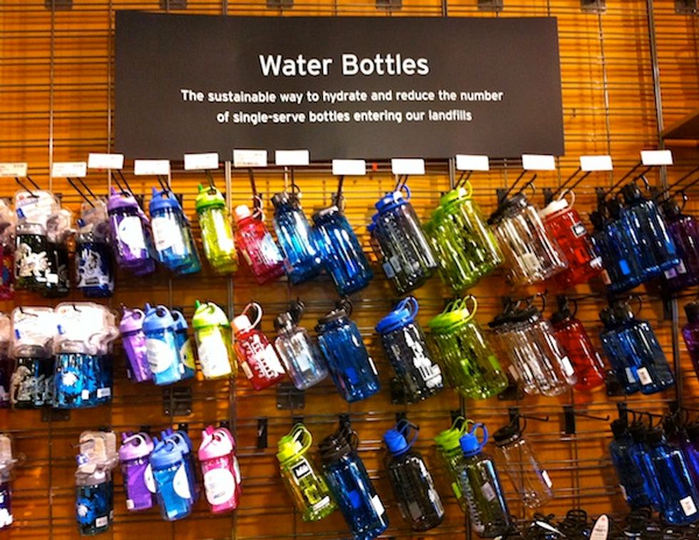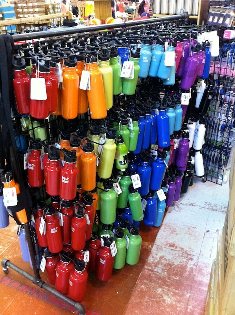 The hands down largest selection is at Sports Basement. I went to the one in the Marina and spoke with a sales associate for some scoop. She said an emerging trend is glass, hence the silicone-covered polka doted 16 oz Lifefactory bottles. These are tempting, in their bubbly colors, but I'm looking for something smaller and sportier. I couldn't help but be allured by the rack of rainbow Klean Kanteens. One of my favorites, Kanteens come in all shapes and top styles. I recommend the stainless steel ones for dudes. But the bestseller remains to be the classic Nalgene; you can find bins filled with juicy options.