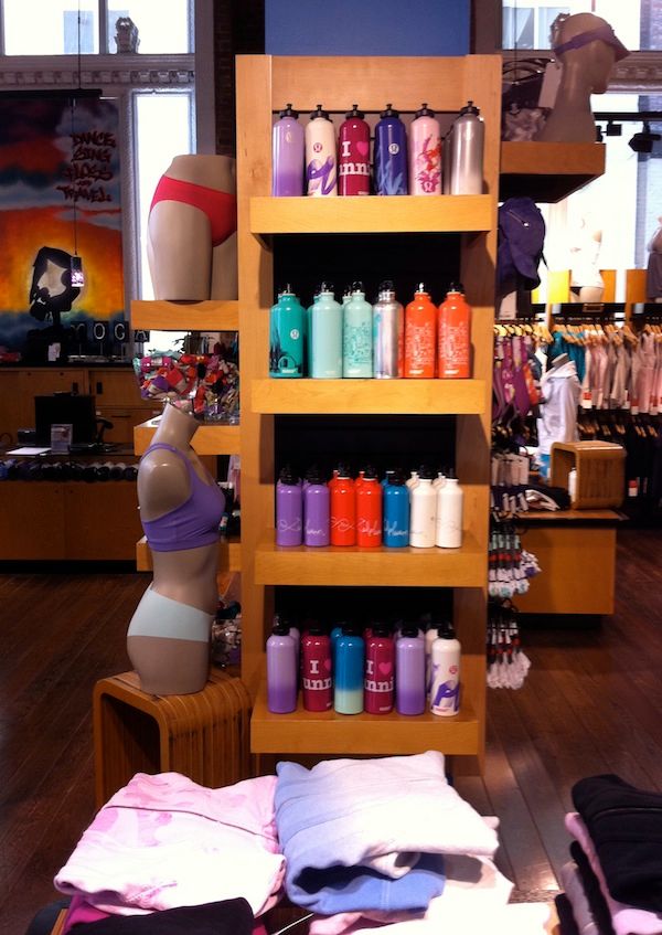 The most feminine options are at Lululemon. Branded Siggs in tropical colors tugged at my yogastrings. A Sigg with a trippy smoke print stood out. If you're a runner, you'll appreciate the "I Heart Running" bottle. Different tops and sizes are available. When in doubt, match your Lulu bottle to your Technithong.